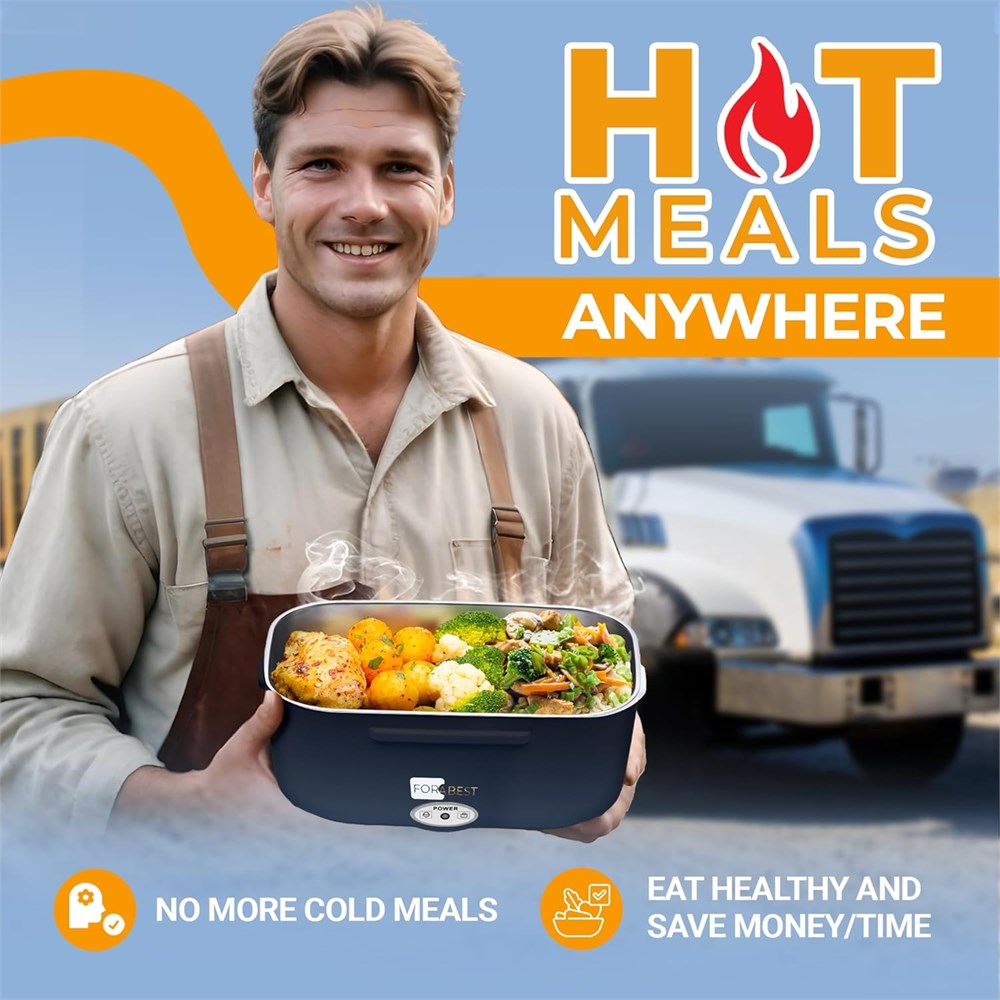 HOT HOMEMADE MEALS ANYWHERE - Say goodbye to cold lunches and fast food. Our 80W portable lunch box warmer heats food in 10-20 minutes, perfect for drivers, travelers, and busy professionals. No portable microwave needed. MULTI-USE DESIGN FOR CAR, TRUCK & OFFICE - Our Food Warmer Lunch Box is compatible with 12V/24V car and truck sockets and 110V/220V home or office wall outlets world-wide, ensuring a hot meal anywhere. A great alternative to a portable microwave for car. This is the best Electric Lunch Box Food Heater for work. A great gift for men and the ideal gift for women. GENEROUS 1.5L+ 0.45L CAPACITY EASY TO CLEAN & DISHWASHER SAFE - This heating lunch box for men and women includes a removable 1.5L 304 stainless steel tray and 0.45L plastic box, for rice, meats, and veggies/salad separately. The leak-proof lid prevents spills, making it ideal for stews on-the-go. Cleaning is a breeze. DURABLE, LEAK-PROOF & FOOD-SAFE MATERIALS - Made with high-quality, BPA-free materials, this electric lunch box for men is a self warming lunch box featuring secure rubber seal and sturdy clamps to prevent spills. Ideal for work, road trips, and remote site lunches. Fast heating and some cooking as stated by our customers. COMPLETE KIT FROM A TRUSTED CANADIAN BRAND - The FORABEST hot lunch box for adults includes an insulated carry bag, 1.5L stainless steel food tray, utensils, 2x 47" longer power cords, providing everything needed for a hot, hearty meal anywhere.