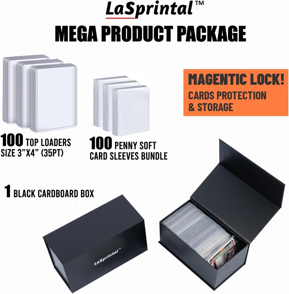 100 Premium Top Loaders & 100 Penny Sleeves & Cardboard Box (with Magnetic Lock) Bundle. 1 Sturdy Cardboard Box with Magnetic Lock for Card storage and easy to open. Rigid Plastic Top Loaders: Made with good quality rigid PVC 0.35mm thickness, 3 x4 sized, Ultra Clear Card Sleeves, keep your cards looking pristine and new. Compatible with MTG cards, most Sports cards, Baseball cards, Basketball cards,Football cards, Hockey cards etc. 3 in 1 Bundle Set for Cards protection and storage.