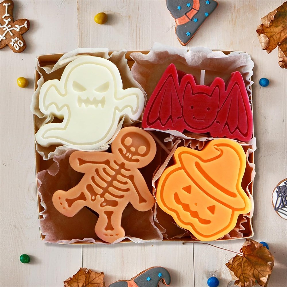 Festive & Frightful Decor Create Halloween atmosphere with this 4pcs beautifully designed candles, each representing a classic Halloween symbol: Pumpkin, Skeleton, Ghost, and Bat. Measuring approximately 1.8~2 inches tall, these candles are just the right size to enhance your holiday decor without overwhelming your space. They re ideal for creating a festive focal point, whether on a dining table, mantelpiece, or as part of a Halloween Deco. Soothing & Refreshing Freesia Fragrance The candles emit a gentle freesia scent, creating a pleasant, soothing atmosphere that complements the Halloween theme. The fragrance is light enough to be enjoyed by all, adding a pleasant aroma to your space without overwhelming the senses. It s the perfect background scent for Halloween parties, cozy nights in, the delicate scent lingers just enough to make a lasting impression on your guests. Safe Eco-Friendly & Non-Toxic Sustainable Our candles are made from safe, eco-conscious materials, ensuring they are non-toxic and free from harmful chemicals. You can use them confidently around children and pets (Ps: Be careful with fire safety) , knowing they burn cleanly and safely. These candles offer a guilt-free way to enjoy the holiday season, combining aesthetics with environmental responsibility. Versatile Decor & Widely used for Halloween Setting These candles are the perfect addition to any Halloween decor, blending effortlessly with various themes and color schemes. Their versatile design allows them to be used in multiple settings, from haunted house parties to elegant Halloween dinners. The 3D shapes and attention to detail make them a standout feature in any room, adding both cute charm and a touch of spookiness to your celebration. Exquisite Gift Packaging Each candle set is carefully packaged in an elegant gift box, making it a perfect present for Halloween lovers of all ages. The box itself adds a touch of sophistication, making the unboxing experience as delightful as the candles inside. Whether you re giving it to a friend, family member, keeping it for yourself, or a colleague, this set offers both beauty and practicality, making it a memorable gift.