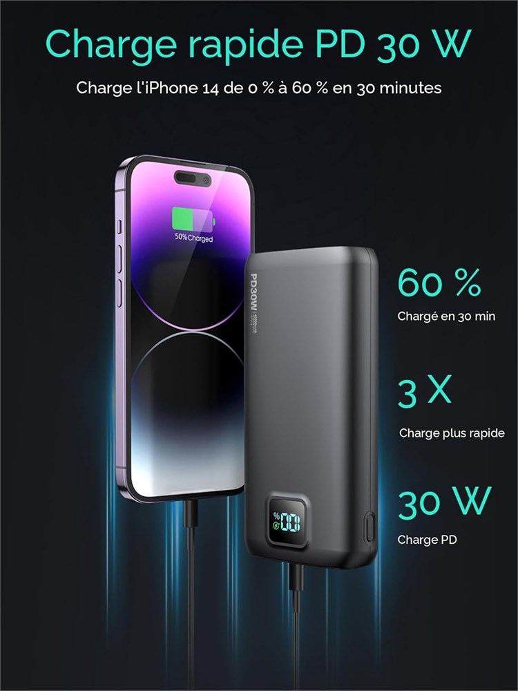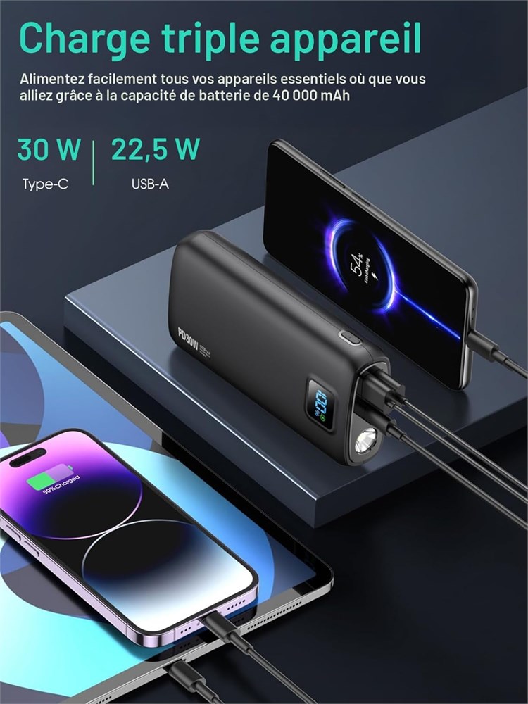 Le chargeur portable adopte les derniers protocoles Super Charger et Fast Charger. Prend en charge la charge super rapide QC4.0+PD30W, il ne faut que 25 minutes pour charger votre iPhone 13 de 20 % 68 %, ce qui est 3 fois plus rapide que la plupart des anciennes batteries externes portables ordinaires de 10W sur le march . La batterie externe dispose d'un port de type C int gr et de deux ports USB, et elle peut charger trois appareils en m me temps. Chargez simultan ment votre t l phone, tablette, casque et plus encore avec une seule solution. Peut tre partag avec des amis pour charger ensemble. Le chargeur portable a une grande capacit de 40 000 mAh. En utilisant la nouvelle batterie polym re haute densit , elle a une plus grande capacit dans le m me volume. Une seule charge suffit pour charger votre t l phone pendant une semaine enti re. Vous permet de vous d barrasser de l'anxi t concernant le niveau de batterie de votre appareil mobile tout moment, n'importe o . Nous n'utilisons que des mat riaux de la plus haute qualit pour fabriquer cette batterie externe, depuis le bo tier ignifuge, la carte m re PCB avec 10 conceptions de protection de s curit qui peuvent filtrer la plupart des dangers tels que la surcharge, la d charge excessive, le court-circuit ou la surchauffe, une batterie au lithium polym re de super qualit de marque bien connue, apr s une inspection rigoureuse en 8 tapes. Juste pour permettre aux clients d'obtenir un produit s r. Chargeur portable power bank int gr avec un cran num rique LED intelligent haute pr cision qui peut refl ter avec pr cision le pourcentage de puissance restante. Permet de suivre facilement l' tat de la batterie. Il y a galement une lampe de poche super lumineuse int gr e, elle peut dissiper l'obscurit , tr s pratique. La batterie externe est galement quip e d'une lampe de poche haute luminosit avec 360 lumens. Avec la grande capacit de la batterie du chargeur portable lui-m me, il peut fonctionner pendant une longue p riode pour dissiper l'obscurit pour vous.