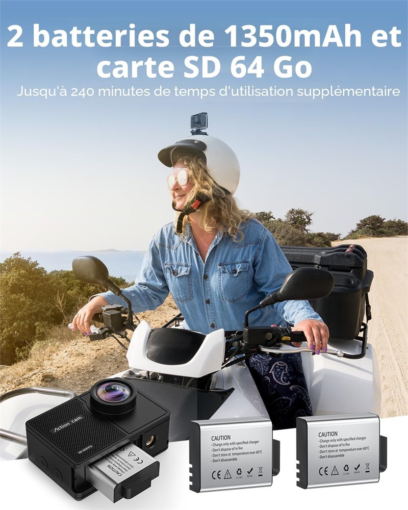 Cam ras d'action 4K 60fps - Capturez chaque d tail avec de superbes vid os 4K 60 fps et des photos de 48 MP. Parfait pour les aventures en plein air, cet appareil photo compact et tanche est votre compagnon ultime. Le TIMNUT 4K 60FPS est une excellente option pour capturer toutes vos aventures en plein air. Cam ra sous-marine de 40 m : la cam ra d'action tanche n'est pas tanche en elle-m me, mais elle est livr e avec un tui tanche inclus, qui vous permettra de l'utiliser jusqu' 40 m sous l'eau. Plongez dans l'action avec le bo tier tanche inclus, valu pour des profondeurs jusqu' 40 m. Id al pour la plong e avec tuba, le surf et tous les sports nautiques. Cam ra casque grand angle : l'angle de vue de la cam ra de sport peut tre modifi tout moment, et au total, il y a 3 options de la plus troite la plus large. Un grand angle donne un tr s grand champ de vision et vous permet de voir plus, et un angle plus troit est mieux pour se concentrer sur un certain objet. Cam ra de sport multifonction : il s'agit d'une cam ra d'action multifonction comprenant l'enregistrement en boucle, la photographie au ralenti, le mode de conduite, le retournement d'image, la photo time-lapse, le r glage de l'exposition, le r glage de la balance des blancs, le Wi-Fi et la t l commande. Cam ra d'action tanche WiFi : la cam ra peut tre facilement contr l e via votre t l phone elle est propre, simple et facile utiliser. Plus de fonctionnalit s utiles incluent la photo en rafale, les photos et vid os en acc l r , le Wi-Fi et la t l commande. Capturez les aventures de la vie, o qu'elles vous emm nent Tous les accessoires : le colis comprend 1 carte SD de 64 Go, 2 batteries de 1350 mAh, un chargeur de batterie, un bo tier tanche, une grande vari t d'accessoires et d'attaches, et une t l commande.