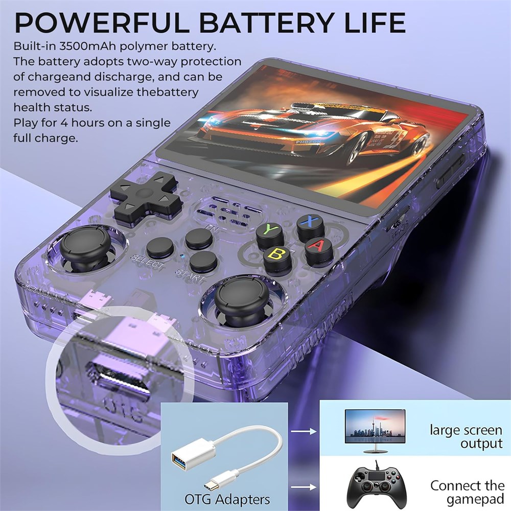 Retro Gaming Console This Handheld console supports up to 20 emulators. adopts open source Linux game system, It offers a smooth and responsive gaming experience across a variety of emulators, provide strong, stable and excellent security, It appeals to both gamers and collectors.Compact and lightweight, It is designed for life on the go. Easily slip it into your pocket or backpack and carry your favorite retro games with you wherever you travel. A Nostalgic Gamer s Drea The RG36 PRO Handheld Retro Game Console acts like a time machine for gamers.It supports over 40,000 games. Whether you're looking for classic hits, well-known console titles, or excellent platform games, downloading and installing them is simple. The user-friendly interface makes finding and playing games a breeze. Perfect for solo play or with friends, it's a fun way to revisit classic gaming. ARM 64bit Quad Core CPU and Dual High-Qualuty 3D Joysticks RK3326 quad-core ARM 64bit cortex-A35 CPU up to 1.5Ghz Powerful gaming chips run a variety of large-scale 2D/3D games smoothly. which can solve the problem of frame dropping in the game, run the game perfectly, and make your game screen smoother.Dual 3D Joystick handheld console Design, You can choose the best button combination according to different games, enhancing the gaming experience. With a 3000 mAh polymer lithium battery Extremely Long Battery Life, Play Anytime, The high-capacity 3000mAh battery supports up to 6-8 hours of continuous gaming on a single charge. Fast charging via USB-C ensures uninterrupted play, whether on the go or just relaxing. It also includes built-in speakers and a 3.5mm headphone jack for an immersive audio experience. 3.5 Inch IPS Full-View HD Screen Featuring a high-resolution IPS screen with a resolution of up to 640x480, the RG36 PRO offers crisp, detailed images with vibrant, realistic colors.ensuring an immersive gaming experience.enhancing both the visual and control experience. making every session on this retro game console a visual treat. Ergonomic Design for Comfort The RG36 PRO Retro Game Console is designed with you in mind. Its ergonomic shape fits perfectly in your hands, providing a comfortable grip for extended gaming sessions.Its streamlined design and responsive buttons reduce hand fatigue during extended gaming sessions, ensuring a comfortable and immersive experience every time. Note 1. When you receive the game console, please insert the TF card into the console. 2. To ensure efficient charging of your handheld game console, we recommend using a charger with an output power of at least 5V/2A (10W) or higher. Please ensure that the device is charged via the DC power port.