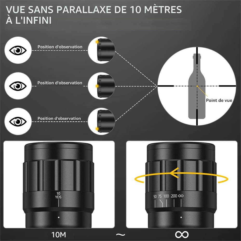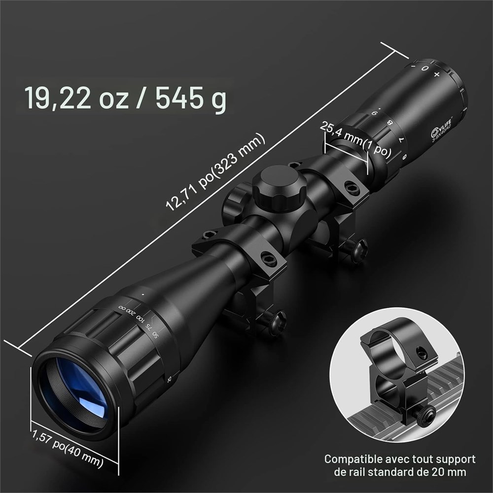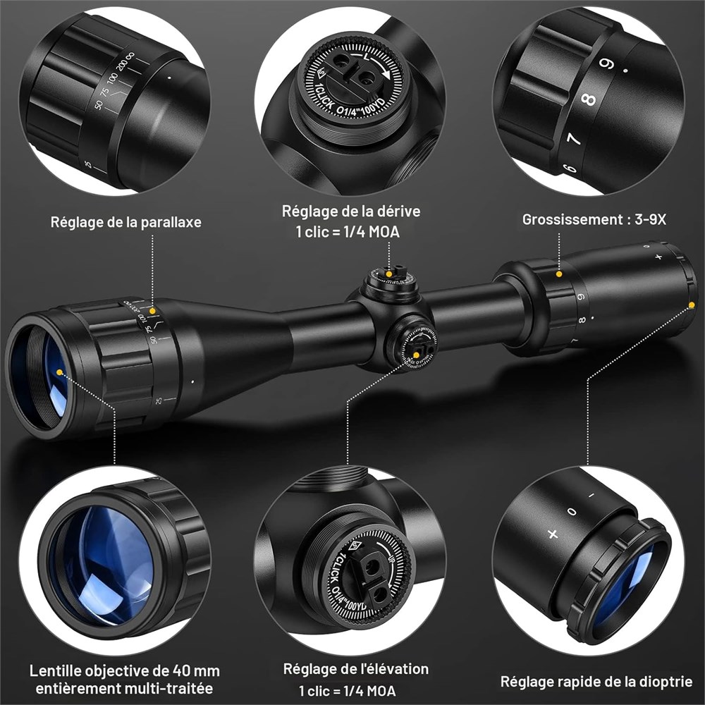 Grossissement : 3 9 x, clart ultime et oculaire sup rieur. Diam tre de l'objectif : 40 mm (1,57") R glage de la parallaxe : 10 yards - Pupille de sortie : 0,2" - 0,67" Complet avec bouchons d'objectif et anneaux de 20 mm.