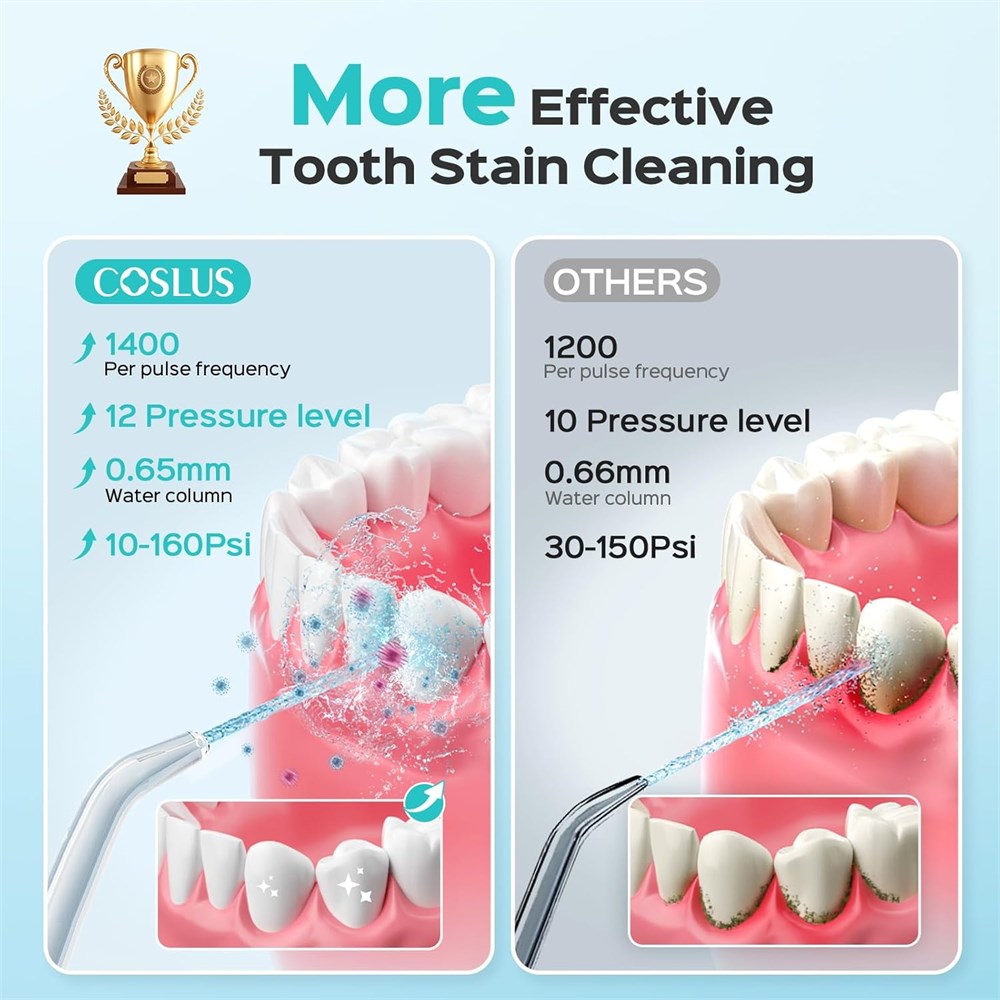 Deep & Gentle Cleaning: This water teeth flosser was developed by the COSLUS R&D team in collaboration with experts. Water teeth flossers offer advanced cleaning technology, which means they adapt to every user, proven to eliminate 3 more stains than manual brushing. This water teeth flosser is designed for daily deep and gentle cleaning through 12 adjustable water pressures and 5 specialized tips, solving teeth cleaning challenges while protecting your teeth. 12 Pressure Settings for Everyone: The COSLUS E2 water teeth flossing for teeth feature 12 tailored cleaning experiences for every family member. From gentle cleaning teeth for kids to deep tartar cleaning for adults, the water tooth flossers adapt seamlessly to diverse needs. The flossers for teeth provide stable water flow and wide and adjustable water pressure for multi-user households. Therefore, water tooth floss is ideal for daily teeth cleaning at home for 6 to 60-year-olds. Patented nozzle storage box included with 5 jet tips: The COSLUS E2 tooth flosser for teeth features vertical organization, quick-drain ventilation, and an adapter to ensure dry, clean accessories for hassle-free family daily cleaning routines at home. 600ml Detachable Tank for Family Sharing: This COSLUS E2 water teeth flosser features a large, detachable 600ml reservoir designed for hassle-free refills and cleaning, ideal for multi-user households. Its high capacity supports continuous daily routines for the whole family, requiring fewer refills. Compact and Stylish Design for Easy Use: The water flossers are built with high-quality materials and are designed to last over 3 years. water tooth for teeth combines space-saving elegance with a sturdy upright stand, keeping your bathroom, kitchen, or sink routine looking modern and organized, even in compact family design.