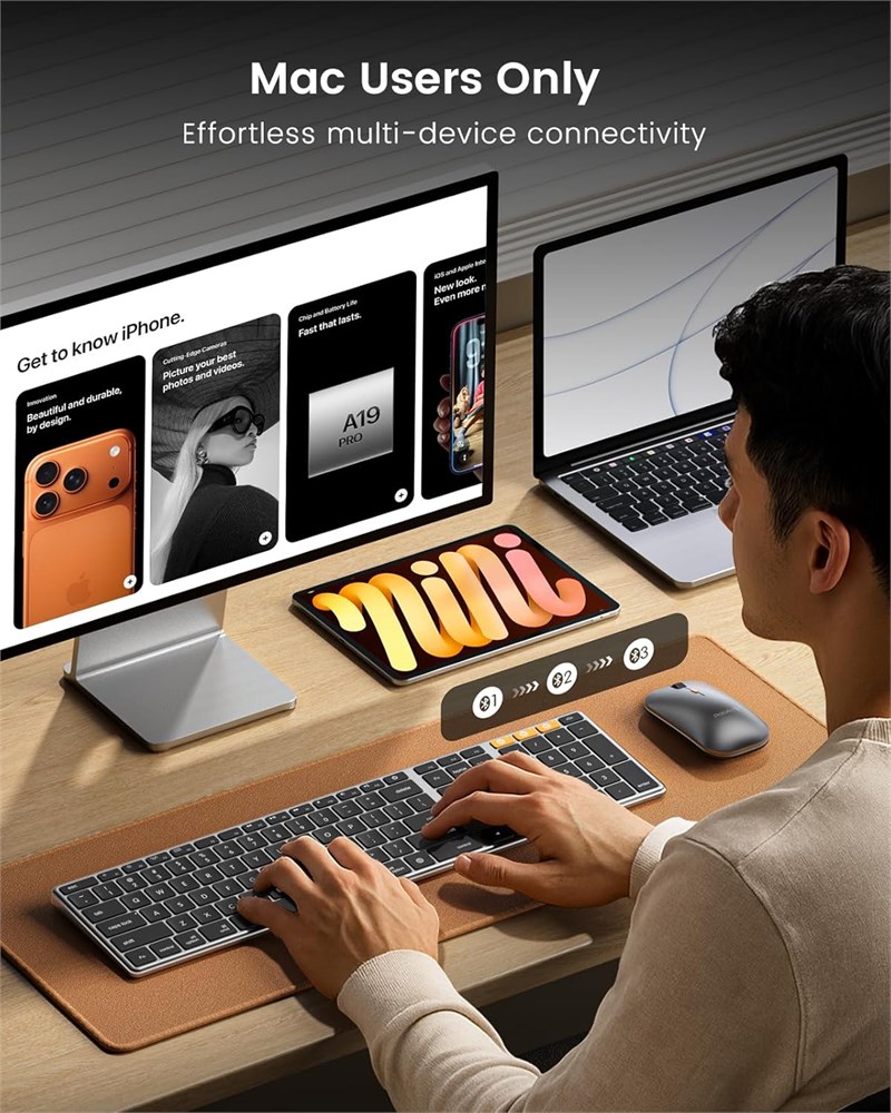Seamless Mac Compatibility: ProtoArc bluetooth keyboard and mouse for Apple are designed to perfectly complement your Mac setup. With a sleek aluminum finish that matches magic keyboard, compatible with macOS 10.12 or later, iOS & iPadOS(13.0 or above), and works with MacBook Pro/Air, Mac Mini, iMac, iPad, or iPhone supporting Bluetooth 5.1 or higher. Note: Macs before 2013, Windows, Linux are not compatible. Adjustable Backlighting for Comfort: Customize your typing experience with 3 levels of adjustable backlighting (low, medium, high) featuring soft white LED lights. Ideal for low-light conditions, the gentle illumination helps reduce eye strain and creates a more comfortable environment. Effortless Multi-Device Connectivity: Easily connect up to 3 devices using Bluetooth. Support up to 3 Bluetooth channels, so you can seamlessly toggle between devices whether you re working on your MacBook, iPad, or iPhone. (USB dongle not included; Bluetooth connection required). Aluminum Design, Responsive Keys: Crafted with a sleek aluminum body that seamlessly blends into your Mac setup, the keyboard offers a smooth typing experience with low-profile scissor mechanism keys. The wireless mouse features 3 adjustable DPI settings (1000/1600/2400) for maximum control. Long-Lasting Rechargeable Power: Enjoy long-lasting use with the built-in 1800mAh rechargeable battery for the keyboard and 500mAh for the mouse. The keyboard automatically enters sleep mode after 60 minutes of inactivity and wakes up instantly with a key press. Note: Backlighting must be manually reactivated after sleep mode. Full-Size Combo for Maximum Productivity: Boost your work efficiency with this full-size combo designed specifically for Mac. The full-size layout may require more desk space compared to compact alternatives, but it provides the comfort and functionality you need for extended work session.