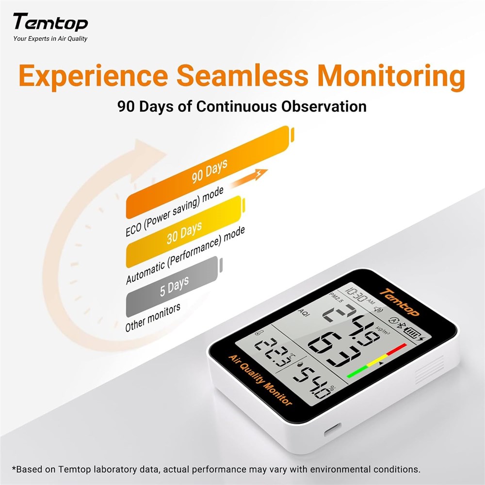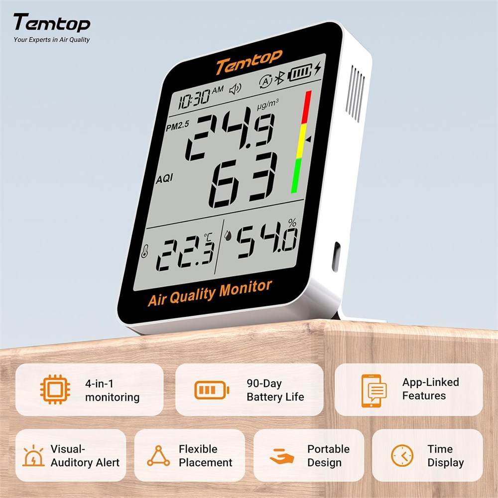 Daily Health Guardian Keep tabs on the air you breathe with this air quality monitor, ensuring a healthy home environment by monitoring PM2.5, AQI levels,T&H you can trust. Long-lasting Battery Life With a battery life of up to 60 days, the device reduces the frequency of battery replacements, making it both environmentally friendly and cost-effective. Easy-to-Read Designed in the USA, our monitor features a clear, easy-to-read display that keeps you informed about your home's air quality at a glance, making it simple to maintain a healthy living environment. Instant Air Quality Feedback Get real-time air quality updates with intuitive color indicators and audible alerts when levels exceed safe thresholds. Plus, stay connected with app notifications for a proactive approach to maintaining clean air in your living spaces. Portable and Discreet With its compact and modern design, this monitor is ideal for various settings including classrooms, office buildings, and more. Its portability allows you to effortlessly move it around different spaces, ensuring optimal air quality wherever you are.
