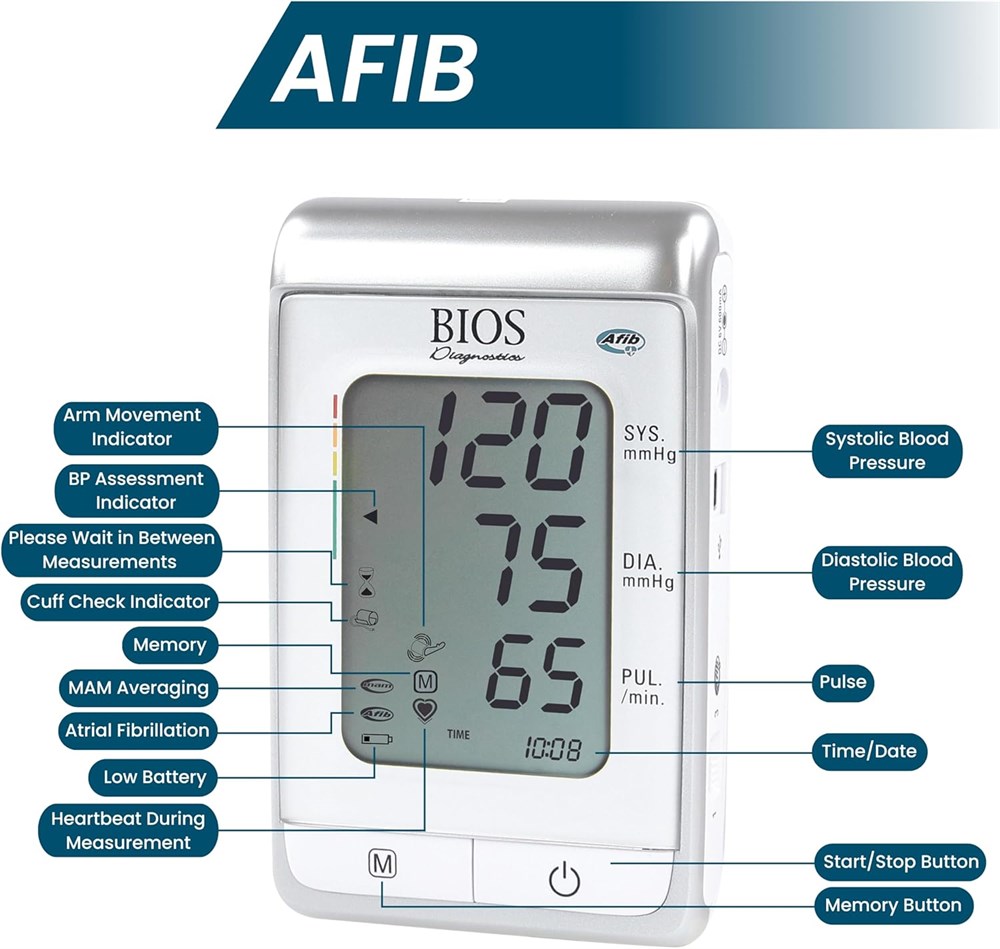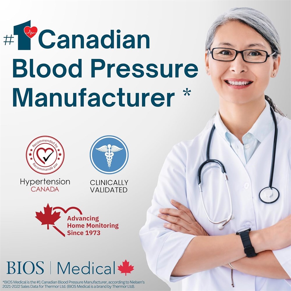 Recommand par Hypertension Canada et homologu par Sant Canada BIOS Medical est le premier fabricant canadien de moniteurs de pression art rielle, selon les donn es de ventes Nielsen de 2021-2022 pour Thermor Ltd. (BIOS Medical est une marque de Thermor Ltd.) Stocke 200 mesures avec heure et date L'ic ne de la technologie de d tection de fibrillation atriale AFIB est affich e lorsqu'une fibrillation atriale est d tect e pendant une mesure de la pression art rielle. La technologie MAM - Averaging Mode utilis e dans l'appareil fournit des mesures pr cises. l'aide de trois mesures cons cutives, votre r sultat est calcul et affich comme une seule mesure moyenne sur l' cran d'affichage. Indicateur de contr le du brassard : indique lorsque le brassard n'est pas correctement positionn et signale quand il y a eu un mouvement. Logiciel d'analyse BP : Un t l chargement gratuit enregistre et pr sente vos lectures sous forme de graphiques. Les informations peuvent tre imprim es ou envoy es par e-mail un professionnel de la sant . L'indicateur d' valuation de la pression art rielle affiche la plage dans laquelle se situent vos valeurs de pression art rielle, selon Hypertension Canada Inclus : tensiom tre, brassard grand format : 22-42 cm (8,75"-16,5"), adaptateur CA, livret de suivi et manuel d'instructions.