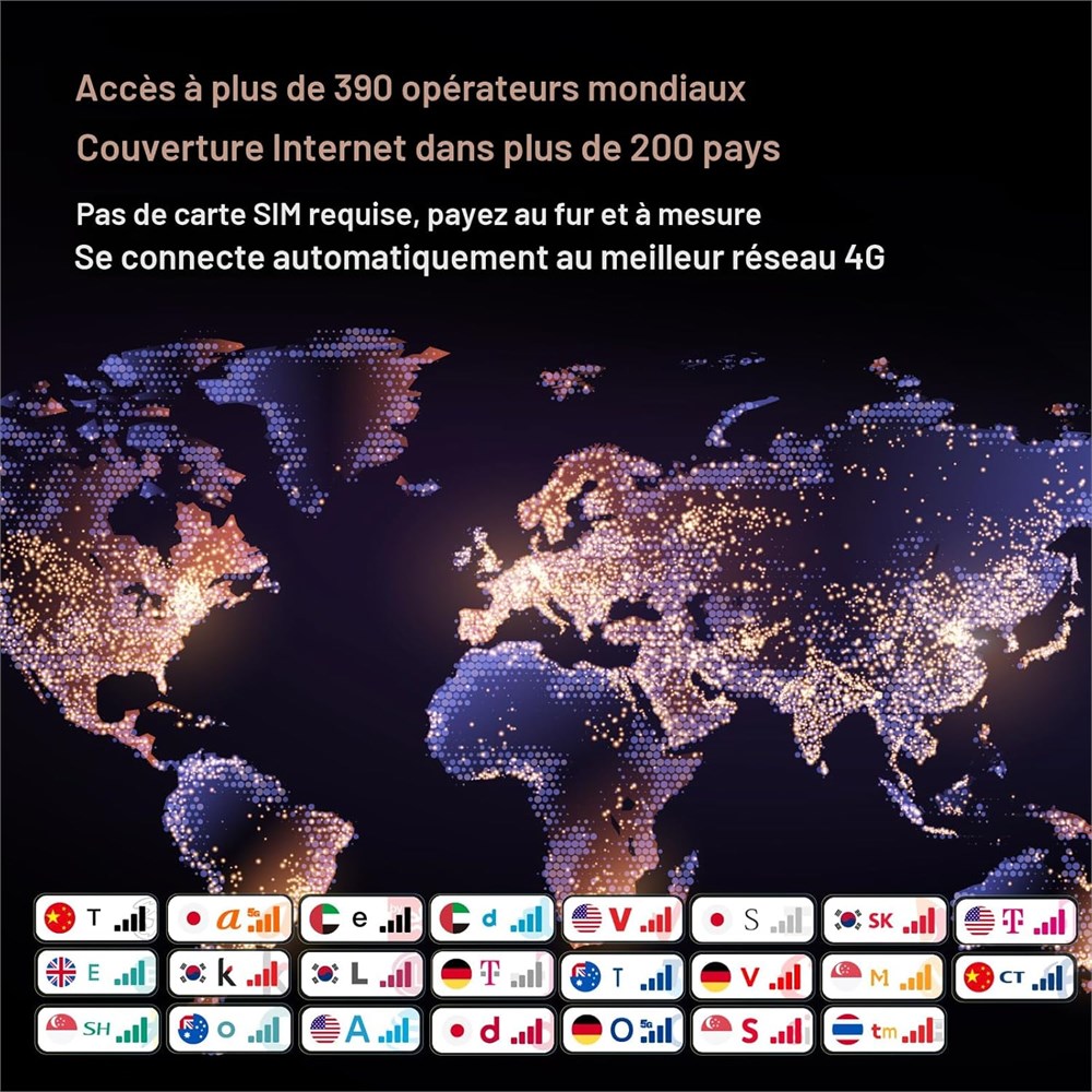 Pas de contrat, sans SIM, couverture mondiale dans plus de 200 pays : nos principaux avantages, pas de carte SIM n cessaire, pas de contrat, couverture mondiale dans plus de 200 pays et r gions, plus de 100 brevets, tout ce qui pr c de vous permet de rester toujours mieux connect . Prend galement en charge un emplacement pour carte SIM, ce qui signifie que vous pouvez facilement utiliser les donn es selon vos propres besoins. Grand cran, taille de poche, 4G MIFI Prend en charge la bande de fr quence compl te, fonctionnement cran tactile. Connectez jusqu' 10 appareils intelligents. Vitesse du r seau 4G ( une vitesse maximale de 150 Mbps de t l chargement/50 Mbps de chargement), protection du trafic et gestion de la liste noire. Interface visuelle et application conviviale : facile v rifier le flux de donn es, l' tat du signal et effectuer d'autres op rations via l' cran visuel. Avec l'application GlocalMe vous pouvez acheter des paquets de donn es ou simplement suivre l'interaction d taill e avec les donn es. Plans flexibles et prix pr f rentiel Donn es par Go, jour ou ann e, payez au fur et mesure. Pas de frais de contrat ou d'itin rance. Co t moyen inf rieur celui des principaux op rateurs. Aucun contrat ni frais d itin rance Appareil portable hotspot WiFi mobile paiement l utilisation. Choisissez le forfait de donn es le plus appropri dans notre application GlocalMe tout moment. Des forfaits de donn es flexibles vous permettent d'acheter le service par jour, mois, r gion ou Go. Et le hotspot portable est livr avec 1,1 Go de donn es globales incluses.