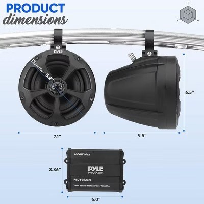 Embark on your next off-road adventure with confidence, knowing you have the ultimate audio setup with our Off-Road Speakers and Amplifier Combo. Engineered to withstand the rugged conditions of off-road driving, this premium audio system delivers powerful sound and unbeatable durability, so you can enjoy your favorite music wherever your adventures take you. Highlights: AMPLIFY YOUR RIDE: Pyle s 1000W marine grade off-road speaker kit is what you need to listen to high-quality audio on your boat, ATV, UTV, quad, Jeep, other outdoor vehicles! Includes (2) 5.25 2-way off-road speaker system along w/ marine amplifier. Impedance: 4 ohm. Power source type: Corded Electric. Speaker size: 5.25 inches. Waterproof: No 1000-WATT POWER: The pair of Pro Audio PowerSport speakers feature an 1000W high powered output. It has an impedance of 4 ohm and is equipped w/ impressive bass response & integrated speaker wiring for quick connection 2-CHANNEL AMPLIFIER: The kit includes a 2-CH marine audio amplifier w/ wired RCA audio input which allows you to connect & stream audio from external devices. Features overload & power protection circuitry, anti-thump turn on & /soft turn-on/off TWO-WAY: The wake board speaker kit features a 24oz magnet structure that powers (2) 1 neodymium dome tweeters, (2) 5.25 polypropylene cones w/ butyl rubber surround and 1 aluminum mid-woofer voice coil for a full range stereo sound reproduction UNIVERSAL MOUNTING: The weather-resistant speakers are protectively stored in a heavy-duty molded cabinet w/ butyl rubber surround. Designed to be mounted on a support bar, frame, roll-bar/cage. Includes necessary wiring cables and mounting hardware Specifications: Dimensions (Overall): 11.61 inches (H) x 15.47 inches (W) x 7.56 inches (D) Weight: 10.99 pounds Electronics Condition: New Wireless Technology: Bluetooth Battery: No Battery Used.