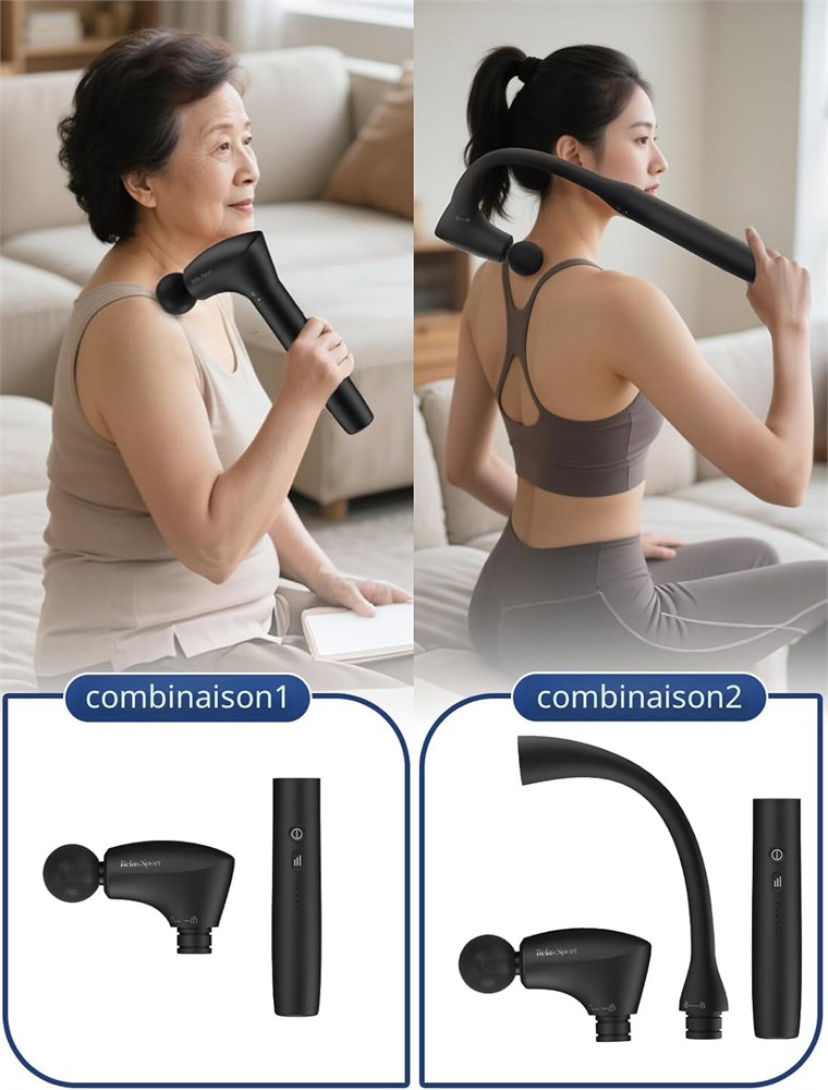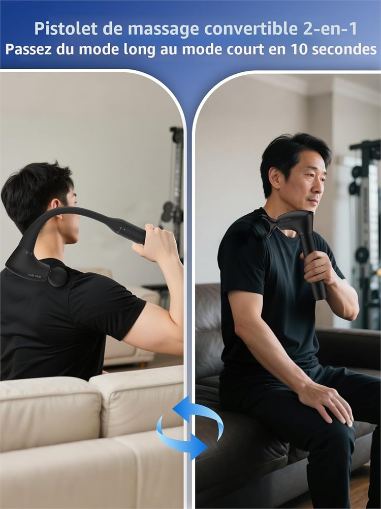 Design convertible 2 en 1 : Passez de la poign e longue professionnelle au mode compact. La poign e amovible se transforme facilement du mode tendu au mode court portable (aucun accessoire suppl mentaire requis). Con u ergonomiquement pour les probl mes musculaires, ciblant sans effort chaque groupe musculaire. Batterie de grande capacit : Deux batteries de 2500 mAh*2 offrent 25 % de capacit en plus que la moyenne. Recharge rapide via charge rapide de type C. (Le temps de fonctionnement s'adapte aux param tres de vitesse/pression). La poign e vendue s par ment permet le remplacement de la batterie sans avoir besoin d'acheter un appareil enti rement neuf. Amplitude profonde de 10 mm et contr le 5 vitesses : amplitude pr cise de 10 mm, associ e 5 niveaux de vitesse personnalisables. D tendez-vous en toute s curit avec arr t automatique de 10 minutes et fonctionnement ultra-silencieux de 30 dB, id al pour une utilisation tard la nuit ou t t le matin. Facile utiliser : dispose d une fonction d arr t automatique de 10 minutes pour une utilisation sans souci, associ e un assemblage simple qui prend seulement quelques secondes pour s ajuster la forme que vous pr f rez. Garantie de 2 ans pour plus de tranquillit d'esprit : Profitez d'une garantie de 2 ans couvrant les r parations ou remplacements gratuits en cas de dysfonctionnements lors d'une utilisation normale. Pour toute question, n'h sitez pas nous contacter nous nous engageons vous soutenir avec le sourire!