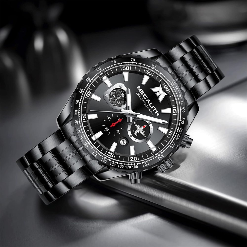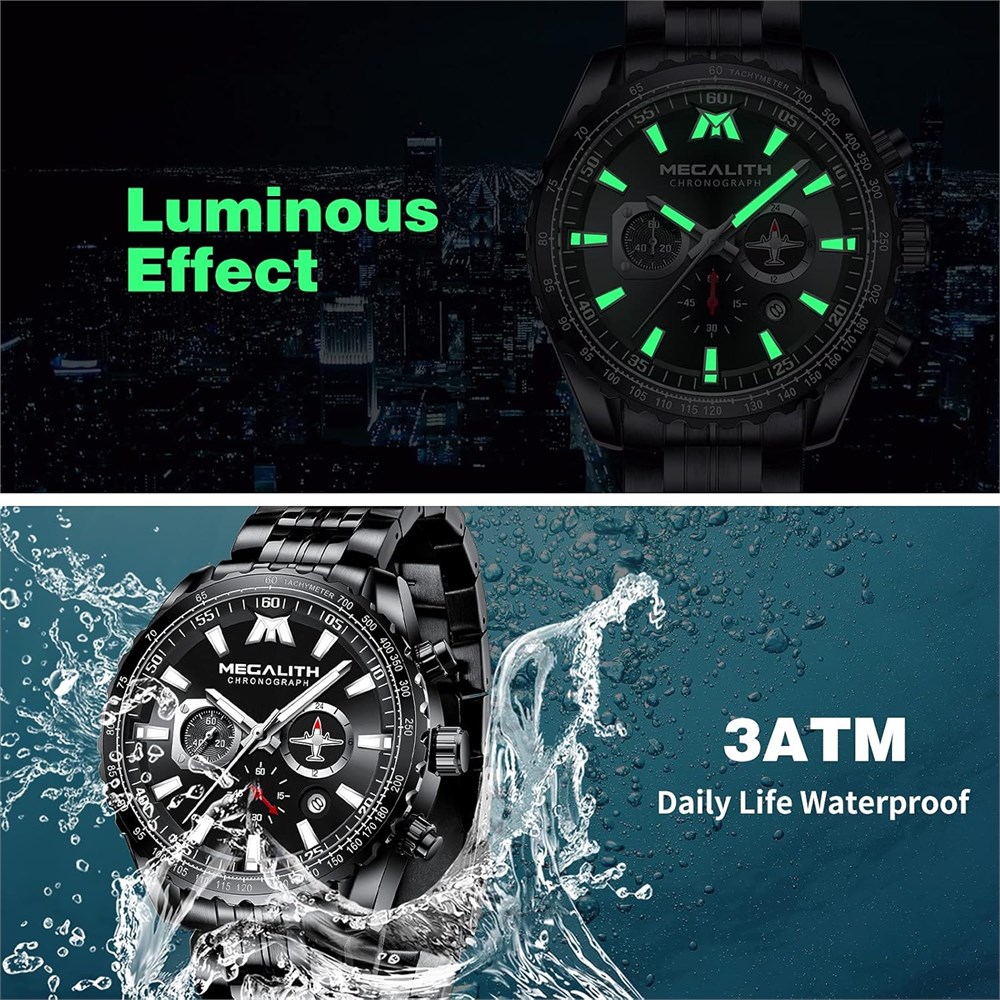 Unique Designer Watches for Men: Our black watch combines functionality with style. 3 functional little sub-dials for chronograph minute, chronograph second, chronograph 1/10 second. All the pointers are working. The small airplane dial chronograph adds a unique and eye-catching element to the overall design, making it a standout accessory for any outfit or occasion. Multiple Functions: This men's wrist watch supports chronograph, date and luminous functions. Luminous hands and scales make it easier to read the time in the dark. 3ATM waterproof meets daily use--water resistant to sweat, accidental rain and water splash. but not suitable for bathing, swimming and diving. Excellent Material: Japanese quartz movement provides accurate time keeping, and the battery can last for over 1 year. High quality black stainless steel strap is comfortable to wear and easy to remove link to fit wrist. High hardness mineral glass is scratch-resistant. Perfect Gifts for Men: MEGALITH black watch men comes in a beautiful box and makes a great men's gift for Christmas, Father's Day, Valentine's Day, Birthdays and more. It's suitable for most occasions, from business to leisure, from indoor to outdoor activities.