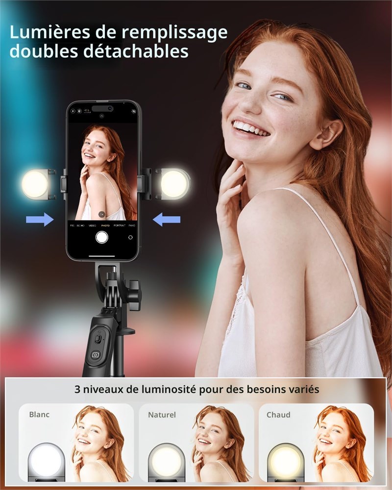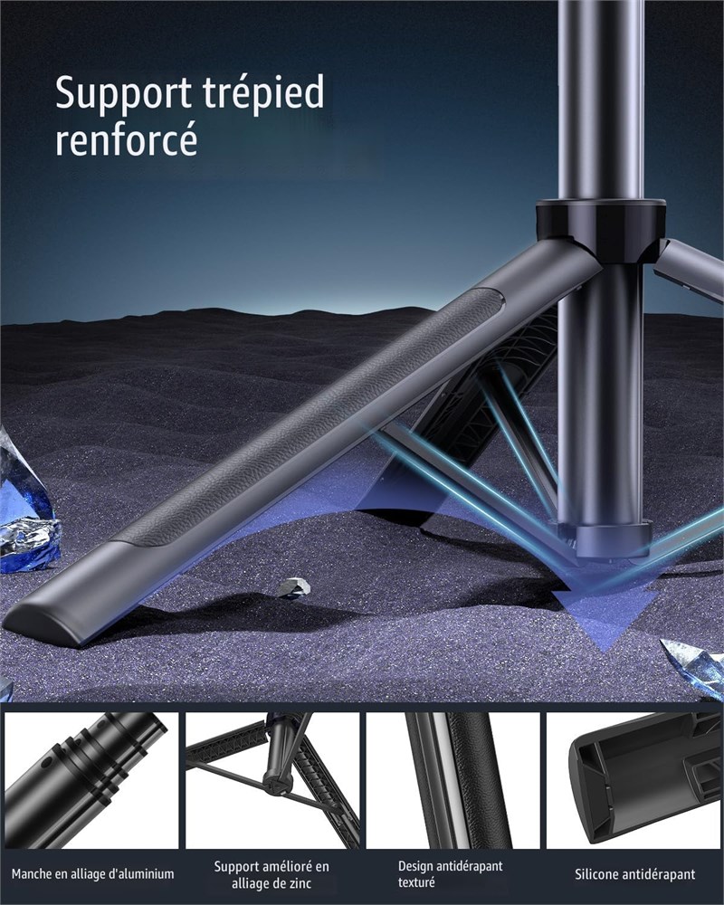 Design en aluminium l ger : fabriqu en alliage d'aluminium de haute qualit , ce tr pied t lescopique pour t l phone est la fois l ger et durable, assurant stabilit et fiabilit dans une vari t d'environnements. Les tiges de support m talliques robustes am liorent la stabilit g n rale pour une utilisation plus s re Compatibilit universelle Ce tr pied pour iPhone est dot d'un filetage int gr de 1/4 de pouce, compatible avec les cam ras, GoPro et clairage annulaire, et le support pour t l phone portable fonctionne avec les t l phones et les appareils Android dont la taille d' cran varie de 4 7 pouces. C'est une solution polyvalente pour tous vos besoins en photographie T l commande rechargeable : la t l commande rechargeable amovible vous permet de prendre des photos et de d marrer des enregistrements jusqu' 10 m tres de distance, et le c ble de charge Type-C vous permet d'alimenter facilement votre appareil photo lors de vos d placements sans les tracas de changer les piles Double clairage LED rechargeable Cette perche selfie avec clairage propose trois modes r glables - blanc, doux et chaud - pour fournir un clairage id al pour les tutoriels de maquillage, les vid os de cuisine et le streaming en direct. R glez l'intensit pour am liorer les effets visuels et minimiser les ombres R glabilit am lior e Dot d'une t te pivotante 360 , d'une inclinaison de 270 et d'une poign e d' quilibrage 360 , ce support de t l phone portable s'ajuste de 11.6 pouces 71 pouces en hauteur pour vous permettre de capturer des angles uniques et des vues panoramiques avec facilit . Le forfait comprend 1 perche selfie, 2 lampes de remplissage LED, 1 t l commande Bluetooth, 1 tui de transport et 1 manuel d'utilisation.