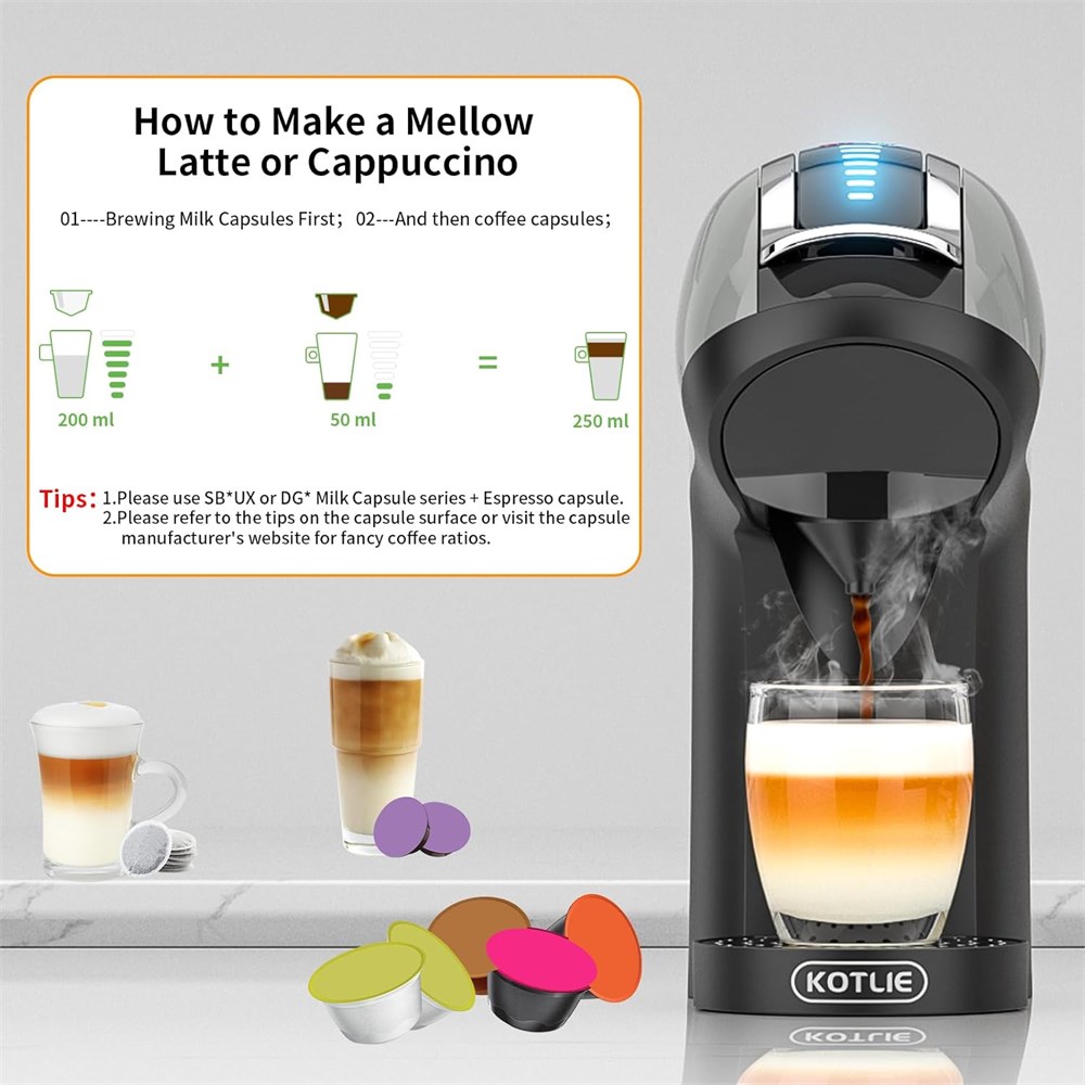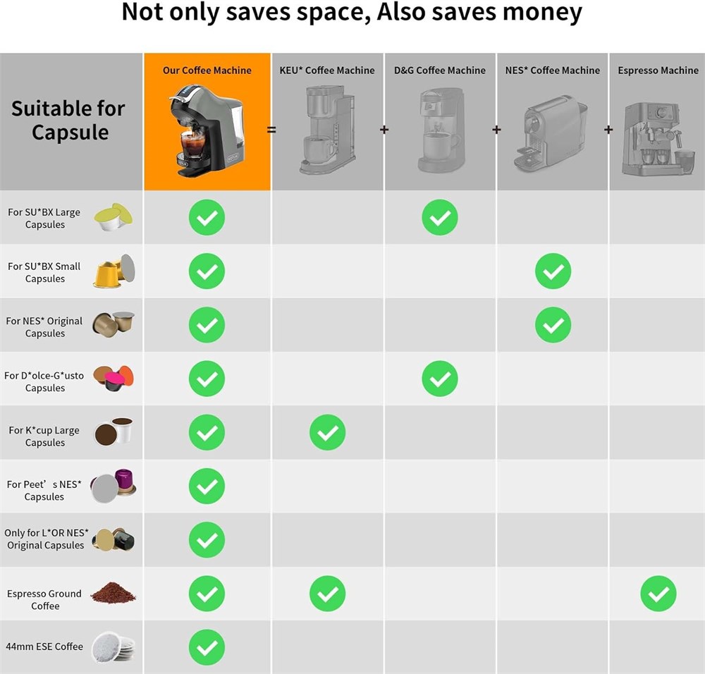 Multifunctional Capsule Espresso Coffee Machine One coffee machine for many different coffee experiences, coffee maker compatible with Dolce Gusto/Nespresso original capsules/LAVAZZA A MODO MIO/L OR/Grounds and ese pod coffee.While saving you money, it also brings you a more simple happiness life. High Quality and Technology 19Bar high pressure coffee maker can rich coffee crema and stable taste.Hot and cold dual extraction modes, 4 temperatures, 7 water levels provide personalised choice. Premium touch screen panel for easy and clear operation. Comprehensive Upgrade Coffee Machine New pre-soak function to enhance the taste of coffee. Hall switch that recognises capsules to intelligently adjust water volume and temperature.1450W heating components, only 25S, enjoy coffee immediately! Fashionable Design for More Enjoyment Coffee machine space is raised to easily put down small and large cups. And it is equipped with large capacity drip tray and 1L removable water tank, save time and effort. With automatic power-off function, more energy-saving and environmental protection.