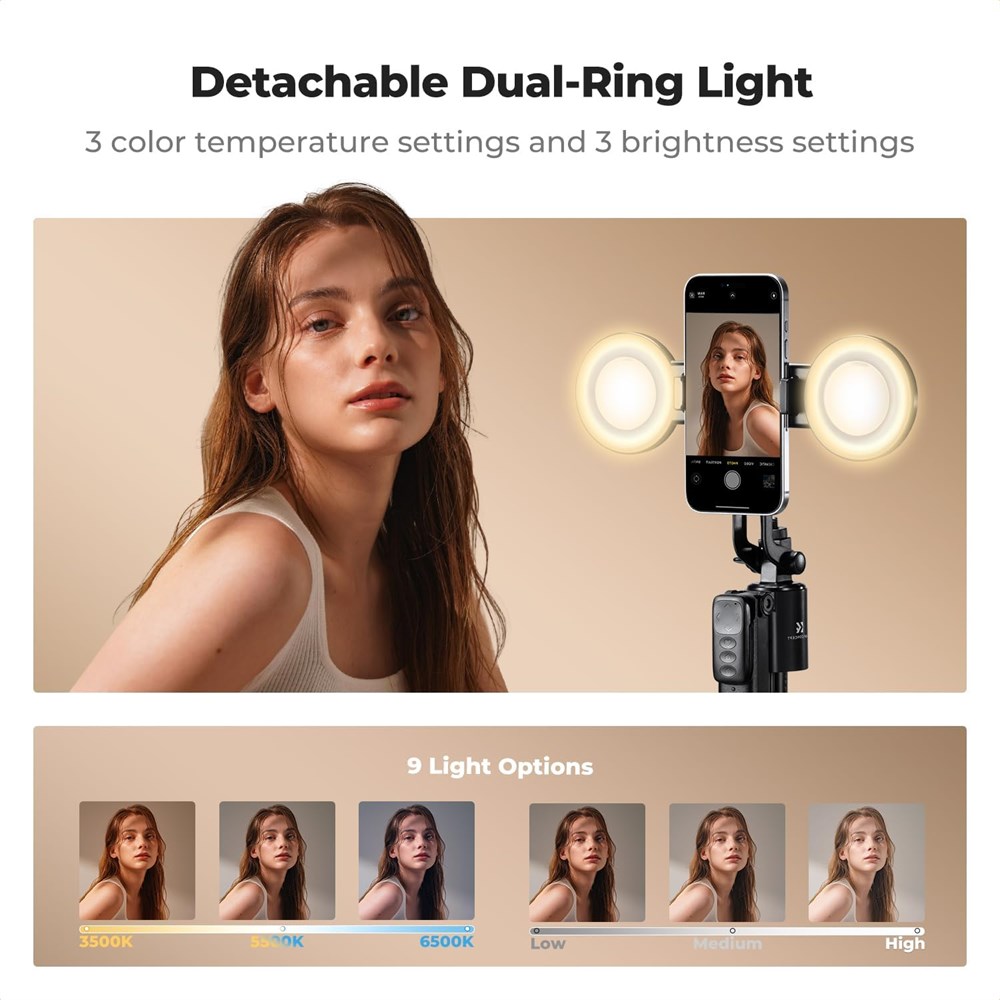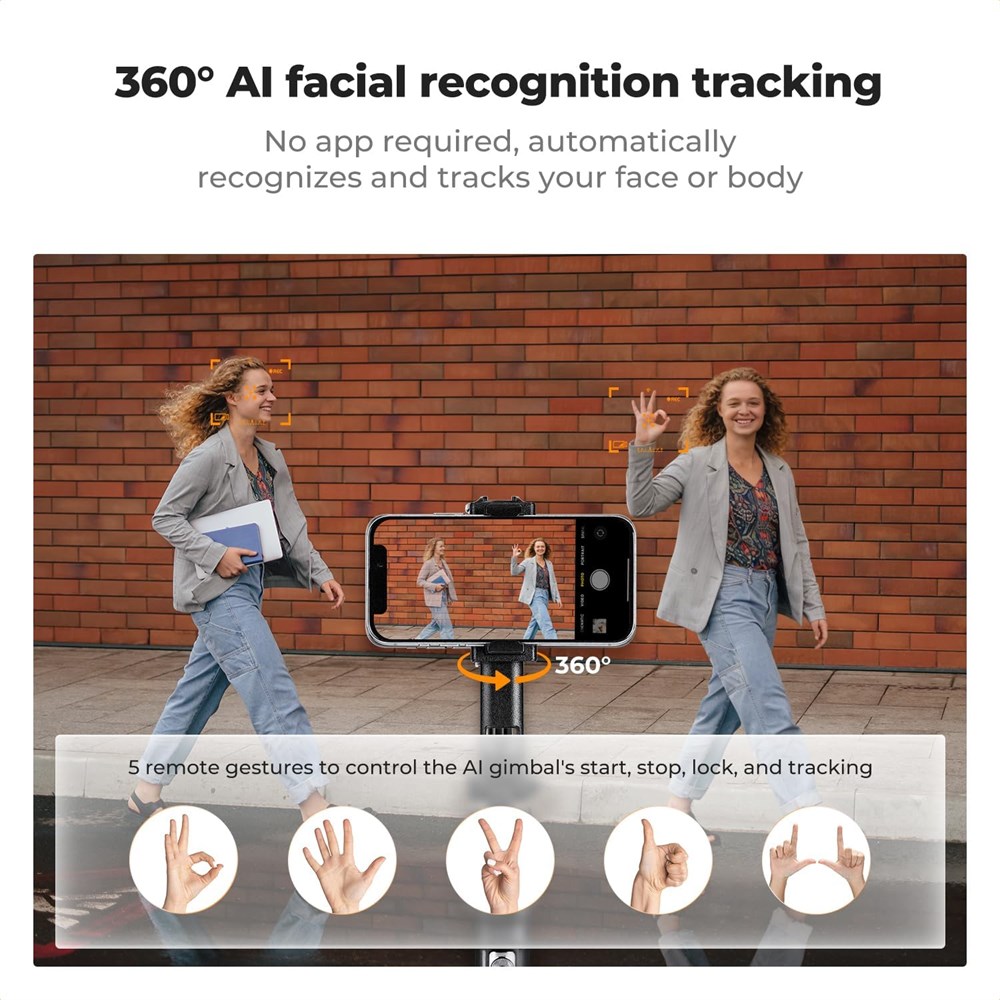 Tr pied de suivi du visage AI 360 : ce tr pied pour perche selfie suit automatiquement les visages ou les corps 360 sans application, jusqu' 10 m de distance. Contr lez-le distance avec 5 gestes simples (OK, Palm, Victory...) pour verrouiller le sujet, mettre en pause ou suivre. Id al pour les cr ateurs de contenu, les streamers en direct et les vloggers. Auto-extension et pliage rapide : rel chez la perche selfie d'une hauteur de 10 cm, et la base du tr pied se d plie instantan ment. Trois m thodes de pliage assurent un rangement rapide et s r sans craindre de se pincer les doigts. Avec une port e extensible de 37 cm ( tat compact) 1,8 m tres, cette perche selfie offre une portabilit exceptionnelle, ce qui la rend id ale pour un usage quotidien et les voyages. Double anneau lumineux avec une large compatibilit : notre tr pied de suivi du visage pour iPhone est quip de deux lumi res de remplissage offrant 6 heures d'autonomie pour un clairage dans un environnement de faible luminosit . L interface standard de 6,35 mm pour perche selfie permet la fixation d accessoires (feux suppl mentaires, cam ras d action), lib rant votre potentiel cr atif. Remarque : La capacit de charge maximale pour la cam ra externe est de 1 kg. Manipulez avec soin pour viter les collisions ou les chutes lors de l'utilisation. Compatibilit tendue : Notre tr pied de suivi facial pour iPhone quip de l'interface de filetage de perche selfie standard de 6,35 mm permet d'ajouter des accessoires (lumi res suppl mentaires, cam ras d'action), lib rant votre inspiration cr ative. Remarque : la capacit de charge maximale pour les cam ras externes est de 1 kg. Manipulez avec soin lors de l'utilisation pour viter les collisions ou les chutes. Tr pied r glable multi-axes multifonction 7 en 1 : ce tr pied polyvalent pour iPhone offre 7 modes : perche selfie, tr pied au sol/de bureau, stabilisateur, bras panoramique 360 , montage au-dessus de la t te et support de diffusion en direct. Son cardan 6 axes (360 + 180 + 90 ) offre tous les angles de prise de vue imaginables pour les iPhones et autres smartphones (largeur 5,5-9 cm).