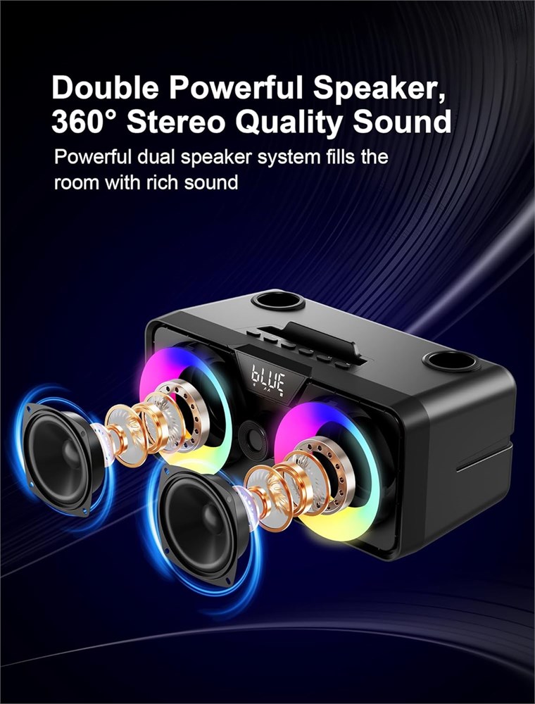 Karaoke Machine with Speaker: The karaoke machine is equipped with a powerful speaker, which can provide you with a clear and wonderful music experience. The high-quality stereo speakers can bring you immersive listening experience. You can enjoy the fun of karaoke singing with your family or friends Excellent Karaoke Sound Portable karaoke machine is equipped with 2* 15W premium full-range speakers, crisp highs, accurate mids, and deep bass, which experience rich, vibrant, and lifelike sounds. Realize all-around surround sound, giving you shocking audio-visual effects.Perfect for parties, family karaoke, weddings, gatherings outdoor/indoor activities.A perfect Christmas gift for kids & adults All-in-one Bluetooth Speaker System Multi-function speaker system with multi-function devices such as karaoke machine, portable PA system, and Bluetooth music speaker. It is an ideal choice for home karaoke. Built-in high-capacity 3000mAh rechargeable battery that can play for up to 2-3 hours. Besides, the USB port enables the power bank function to recharge your smartphone/tablet Upgrade Dual Wireless UHF Microphones This wireless microphone is designed with advanced active noise reduction technology, a professional DSP audio processor, and the EQ chip to auto-adjust treble and bass. Stable and reliable signal while you are singing and no worries about cutting off. Every word from you will be perfect!It would be connected automatically when both are turned on, An ideal gift choice for your kids who fall in love with performance and music for speech or singing Bluetooth 5.0 The Karaoke speaker boasts the latest Bluetooth 5.0 chip, ensuring seamless Bluetooth connectivity with smartphones/tablets to play music. It functions as both a Karaoke machine and a Bluetooth speaker, allowing you to host music parties anytime. It supports TF Card/USB/AUX IN and works with various external devices like iPhone, Android phone, iPad, TV, PC, etc. Connecting it to your TV using an AUX/RCA cable enables synchronized lyrics for the ultimate home Karaoke experience Make It A Duet Long press the "A= B" key for 2 seconds to switch the "CHA" and "CHB" frequency bands. When the two microphones are in the "CHA" and "CHB" frequency bands respectively, the microphone can be a duo. When both microphones are in the same frequency band, only one microphone can be used.Sing sweet solos and duets with Two wireless microphones.Besides, A phone or tablet stand is prepared for you intimately: supports Devices up to 3.9 inches Colorful Disco Lights There are shining and color-shifting LED lights on the front of the karaoke speaker,Press the 'LED' button to turn on /off all lights with one click.It has 3 light modes (pulsating to music, color gradient,and flashing)which can change color with the beat of the music.Not only will it light up the room but also The colorful LED lights create a pleasant and romantic party vibe for you.It allows you to use it conveniently on both formal and casual occasions.