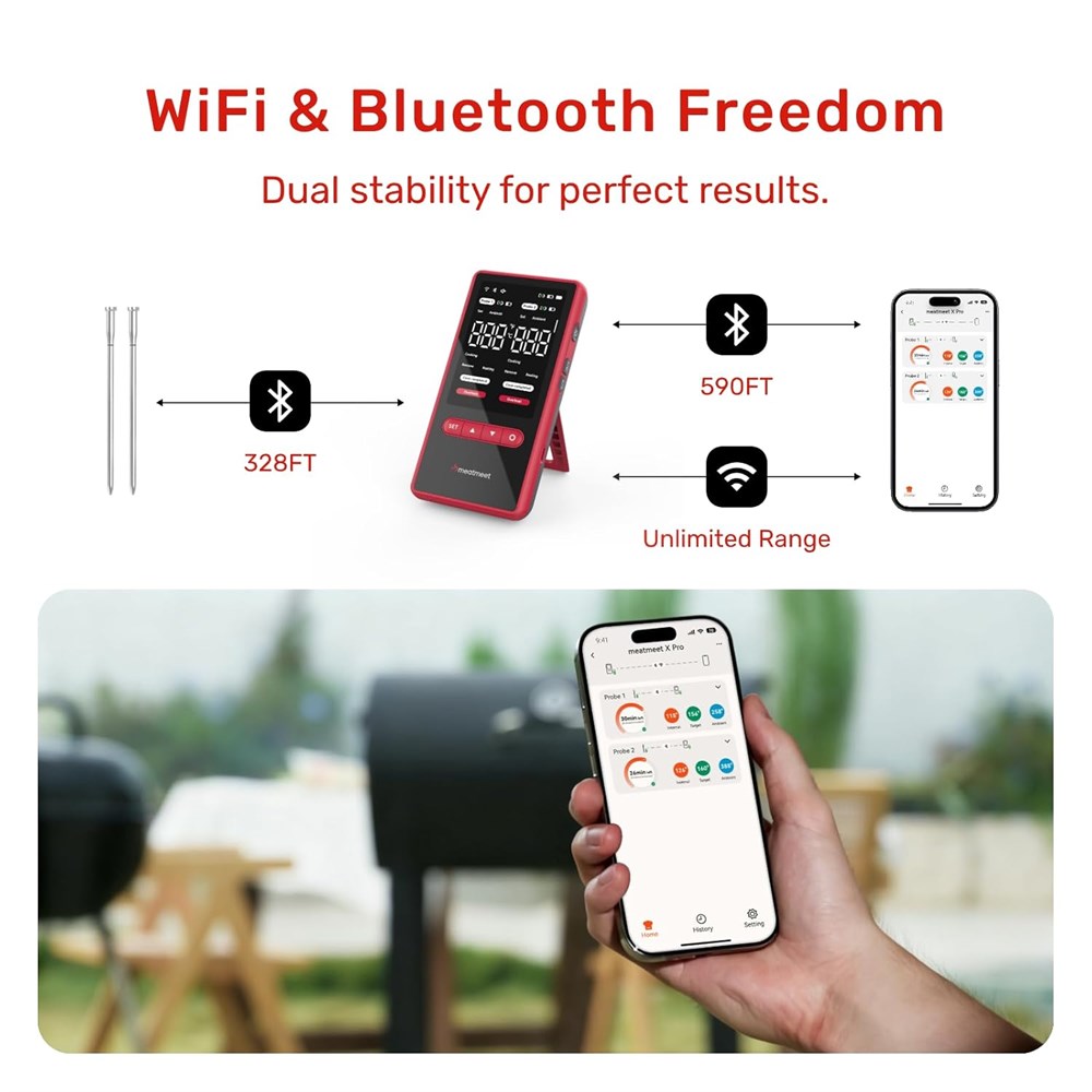 This wireless meat thermometer features both Wi-Fi and Bluetooth connectivity powered by an advanced dual-core processor for a stronger, faster signal. Whether you re by the grill or inside the kitchen, you ll enjoy stable, real-time monitoring without interruptions ideal for BBQs, smokers, and ovens. Each meat probe includes 6 built-in sensors 5 internal and 1 ambient providing ultra-accurate readings up to 0.18 F. Get precise temperature tracking for perfect doneness every time, whether you re using it as a cooking thermometer for steak, chicken, or brisket. No sign-up, no login, no personal info required. Simply power on the digital meat thermometer base, insert the probes, and start cooking right away. Want remote control? Connect to the Meatmeet App anytime to check live temperatures from anywhere. Never pause your BBQ again. Just 5 minutes of charging powers up to 10 hours of cooking; a full 30-minute charge delivers up to 30 hours of use. The base lasts up to 36 hours perfect for all-weekend cookouts and long smoking sessions. Built to handle real kitchen conditions, this wireless cooking thermometer is fully IP69 waterproof. Rinse it under running water or place it in the dishwasher no worries, no mess. Durable, food-safe, and easy to maintain for everyday cooking. Monitor two dishes at once with dual ultra-thin meat probes. Track both temperatures simultaneously each with its own target alerts. Great for cooking different meats or sides at varying doneness levels. The Meatmeet X Pro meat thermometer combines a sleek stainless-steel design, high precision, and smart features that impress BBQ enthusiasts and home chefs alike. A thoughtful gift for birthdays, holidays, or any grilling occasion.