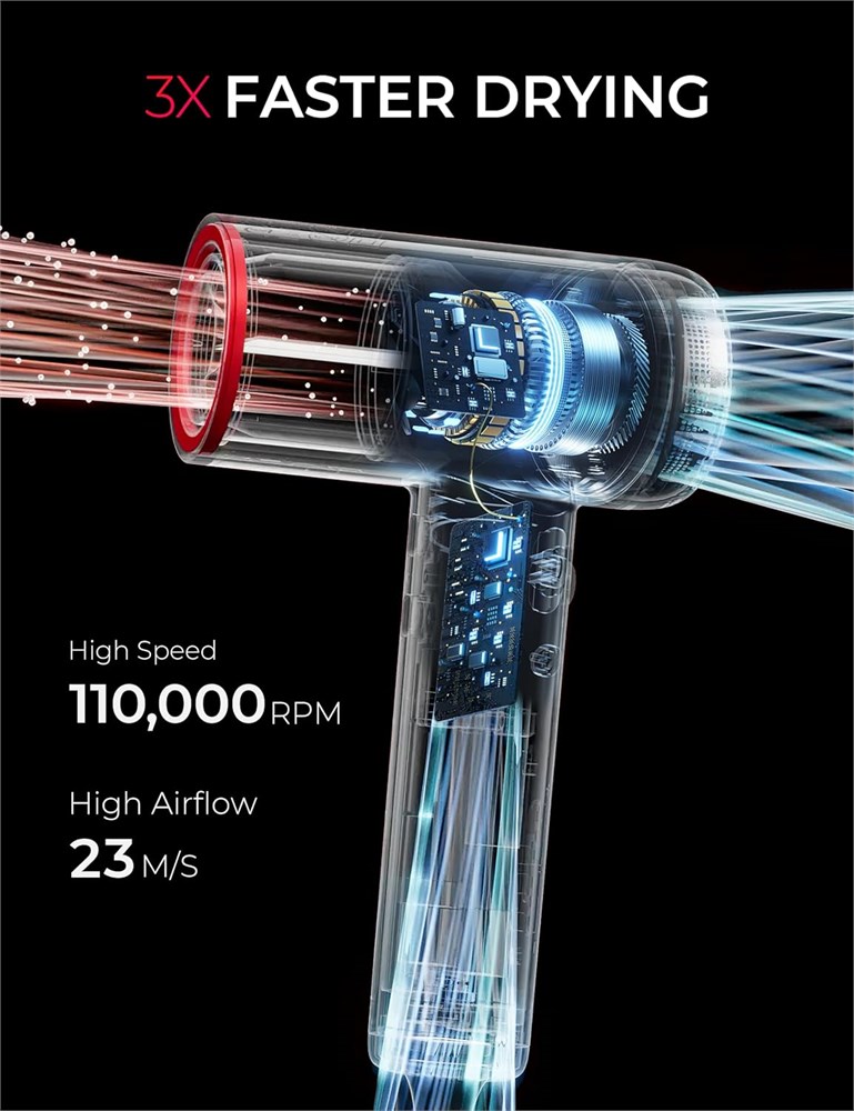Powerful Faster Drying TYMO AIRHYPE Lite Hair Dryer, equipped with 110,000 RPM brushless high-speed motor combined with optimized high-volume airflow, it offers 2X faster drying results than regular dryers. ThermaGlide Technology TYMO AIRHYPE Lite incorporates ThermaGlide technology, ensuring precise temperature control and even heat distribution. Say goodbye to hotspots and the risk of heat damage, allowing for safe and effective drying for all hair textures. Billion Level Negative Ions The integrated negative ion generator emits billions of negative ions while in use, resulting in smoother, healthier hair with significantly reduced frizz for a professional, polished look. Constant Heat Monitoring With the built-in T-sensor constantly monitoring and adjusting the temperature output 100 times per second, this hair dryer ensures consistent and safe heat levels, preventing overdrying even during extended use, delivering consistent results you can trust. Featherlight Compact Design This blow dryer is designed to be lightweight and compact, weighs in at just 0.8lb, making it an ideal travel companion, ensuring top-notch hair care on the go.