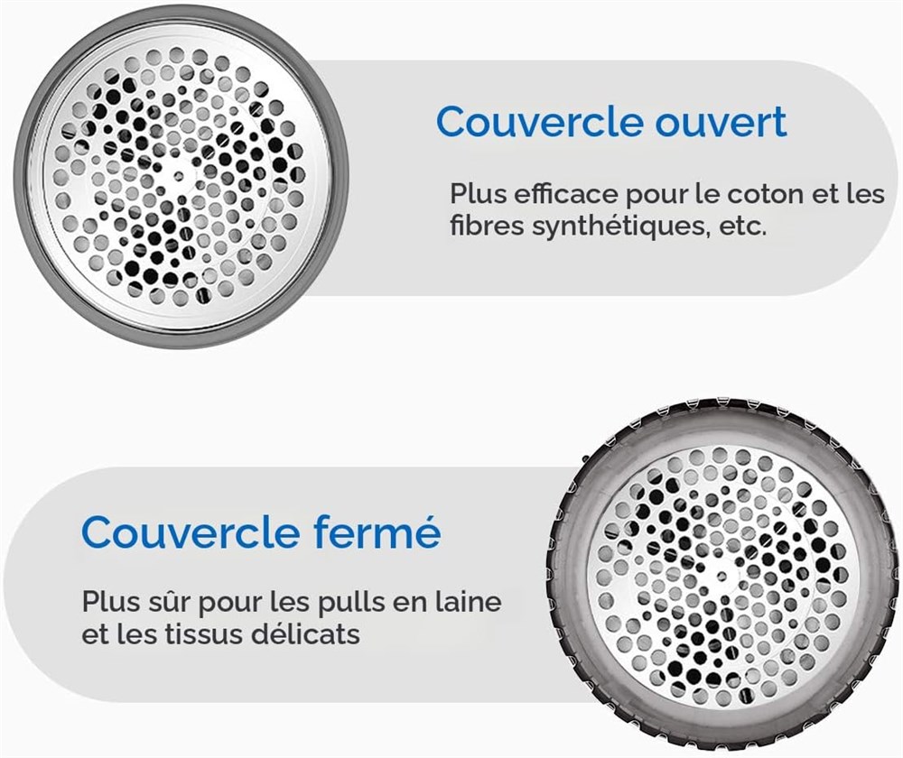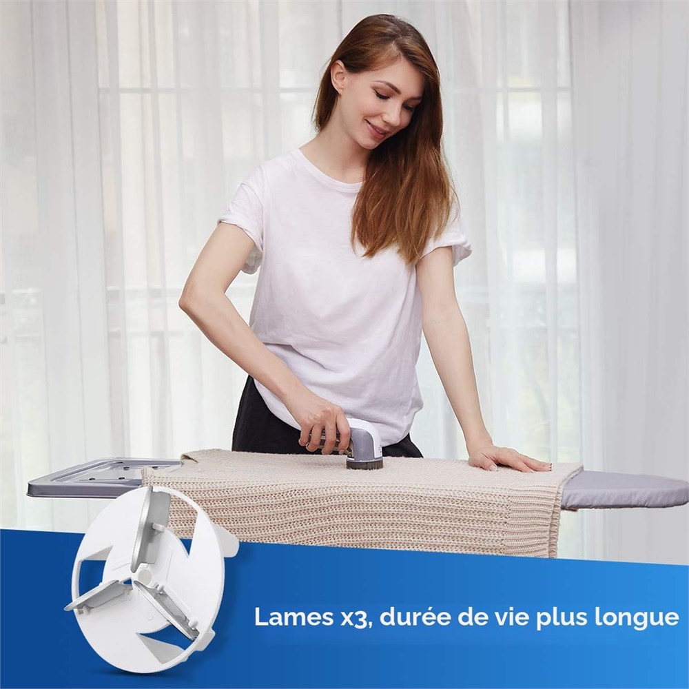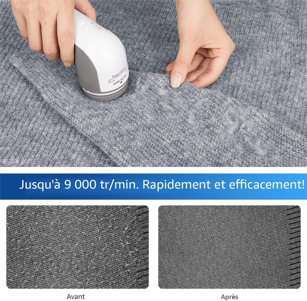 Enlevez facilement les peluches, les bouloches, les boules de duvet et les n uds de vos v tements et tissus pr f r s Convient pour les pulls, maillots, couvertures, draps de lit, tissus d'ameublement et bien plus encore, mais pas pour enlever les poils d'animaux Lames tranchantes et durables qui durent des ann es et sont facilement rempla ables avec 2 lames suppl mentaires incluses 3 hauteurs de rasage, 2 vitesses et 3 tailles de trous de rasage pour diff rents types de tissus et tailles de bouloches L'entretoise r glable en hauteur prot ge les pulls en laine et les tissus d licats contre les coupures ou les accrocs Pour enlever certains bouloches difficiles atteindre, il est recommand de retirer l'entretoise sur la grille du rasoir Le m canisme de verrouillage de s curit prot ge vous ou votre famille des blessures lorsque le couvercle de la lame est ouvert ou desserr Moteur puissant tournant jusqu' 9 000 tr/min, enl ve rapidement toute la peluche, les peluches et les boulochages sur vos v tements ou meubles Le grand bac de collecte vous aide raser plusieurs v tements la fois sans avoir besoin de le vider fr quemment Aliment par 2 piles AA, ce qui le rend compl tement sans fil et facile utiliser sur une grande surface.
