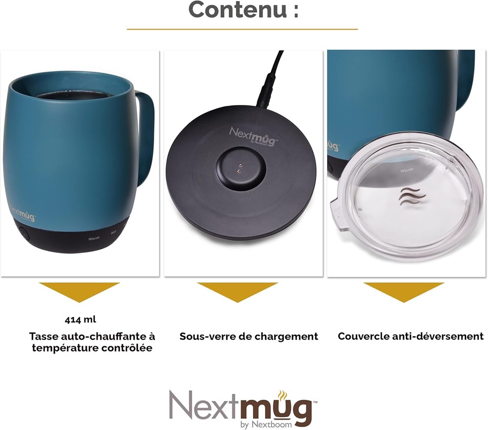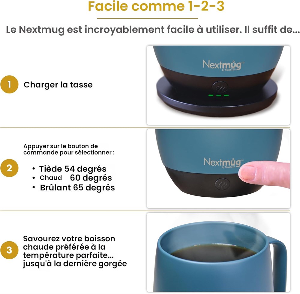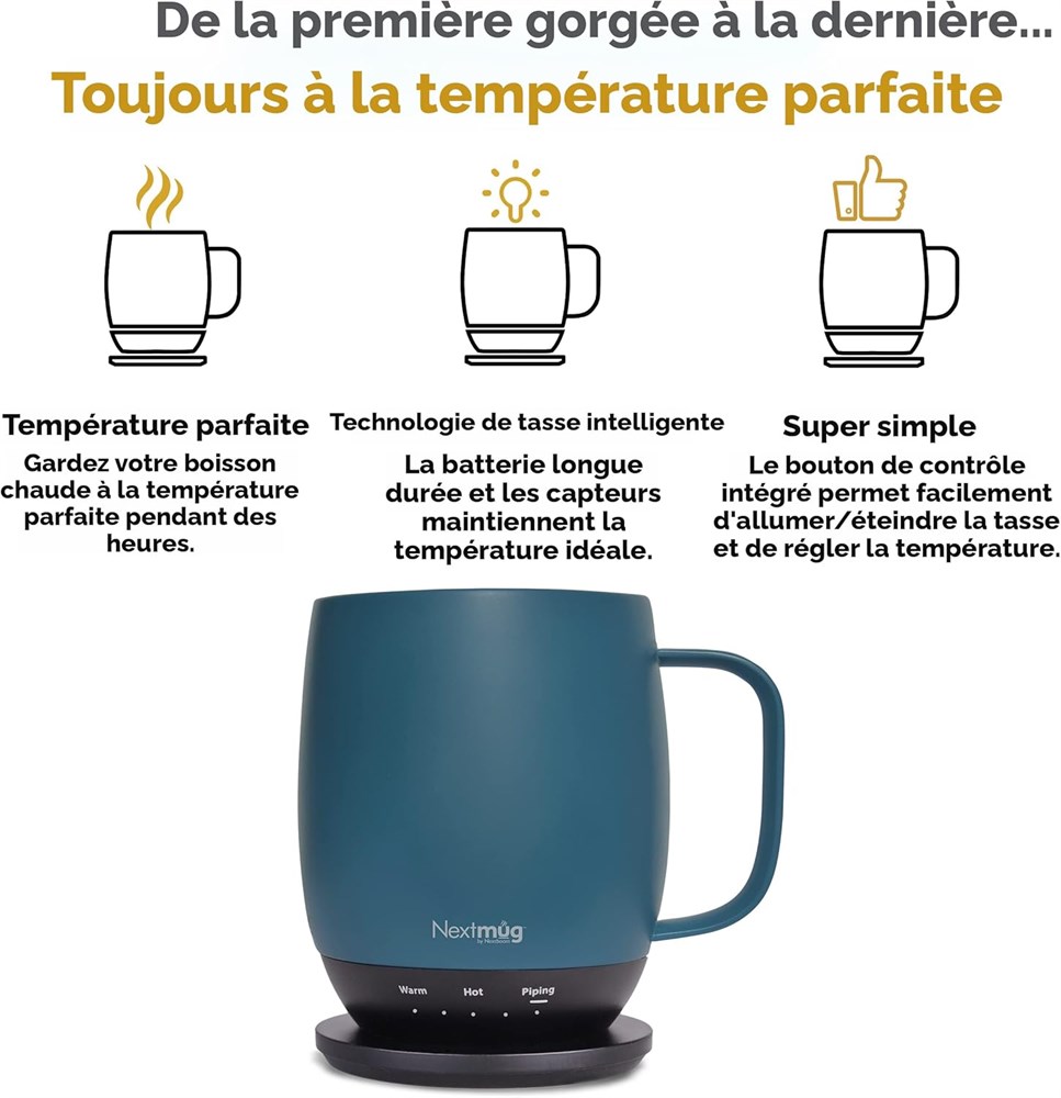 Toujours la temp rature parfaite : la tasse Nextmug gardera votre caf chaud, th ou boisson pr f r e la temp rature parfaite o que vous soyez. S lectionnez simplement Chaud (55 C), Tr s chaud (60 C) ou Tr s tr s chaud (65 C) et profitez-en pendant des heures. TECHNOLOGIE SMART MUG - La batterie longue dur e maintient votre temp rature id ale. Les lumi res LED affichent la dur e de vie de la batterie et la temp rature en temps r el. Inclus : Couvercle r sistant aux d versements et sous-verre de chargement. Super simple : le bouton de contr le int gr allume/ teint facilement la tasse et r gle la temp rature. Prend seulement quelques secondes pour r gler la tasse votre temp rature parfaite. Aucune application requise - Pas de mot de passe, de red marrage ou de probl mes de s curit . Fabrication soign e : l gante finition mate en c ramique recouvrant le corps durable en acier inoxydable de la tasse. Le corps et la poign e ergonomiquement con us et brevet s tiennent parfaitement dans vos mains. Id al pour la maison, le bureau ou le bureau domicile. LE CADEAU PARFAIT - Offrez un cadeau qui fera certainement plaisir. Parfait pour tout le monde sur votre liste... mamans, papas, grands-parents, enseignants, anniversaires, remises de dipl me et plus encore CE QUI EST INCLUS - (1) Nextmug de 415 mL ; (2) Socle de recharge et cordon de 1,8 m pour charger la batterie lithium-ion l'int rieur du Nextmug ; (3) Couvercle anti-d versement pour garder les liquides chauds dans la tasse et aider maintenir la temp rature id ale pendant de plus longues p riodes. Tous les Nextmugs sont enti rement compatibles, y compris les tasses, les couvercles, les sous-verres et les accessoires.