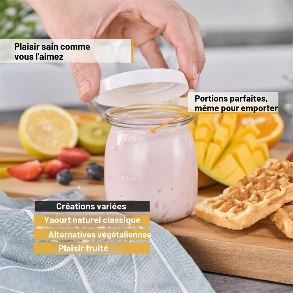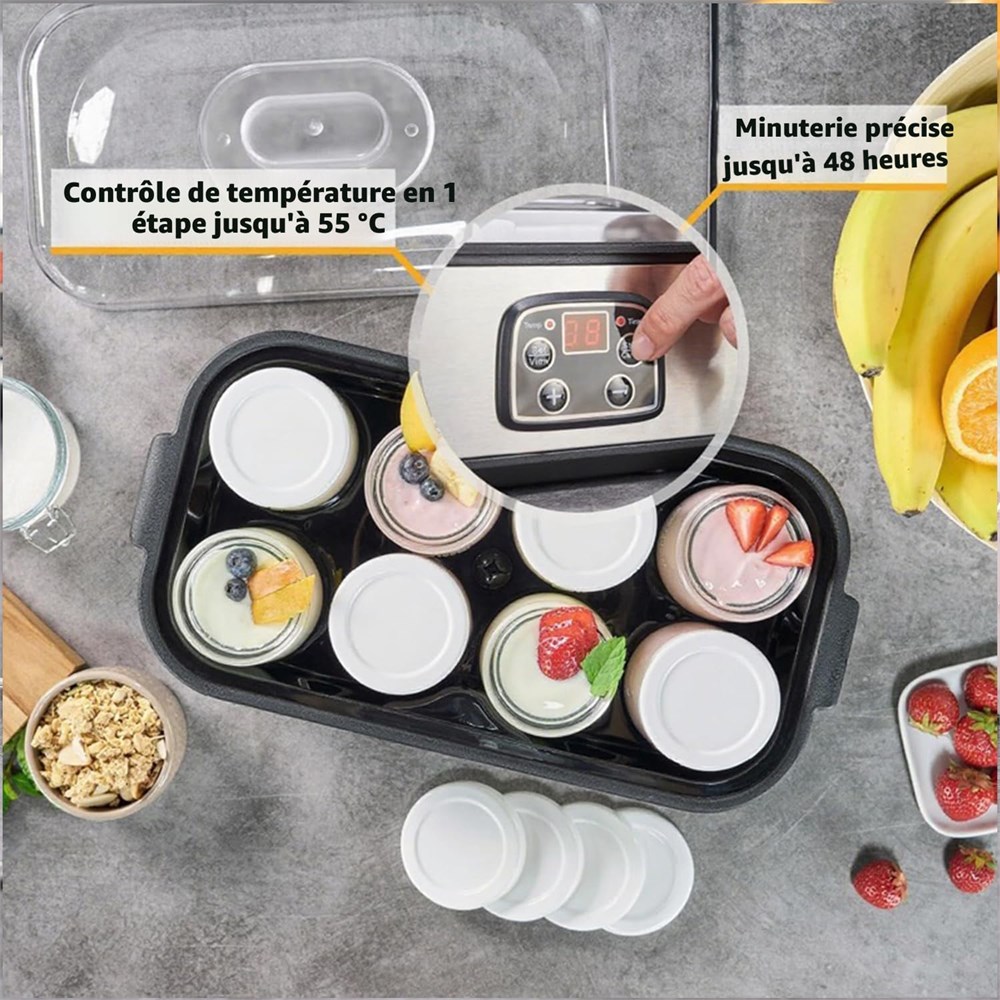 Moteur de yaourt probiotique de pr cision pour une culture optimale : cette yaourti re automatique temp rature r glable dispose d'un moteur de yaourt probiotique con u pour maintenir des gammes parfaites de 36,7 46,1 C, augmentant les cultures vivantes de 50 %. Contrairement aux yaourti res de base, son moteur assure une fermentation silencieuse et constante pour des r sultats cr meux chaque fois Contr le de temp rature r glable de 20 55 C : 100 % SANS BPA - La machine yaourt probiotique ultime poss de des r glages de temp rature r glables de 20 55 C (68 131 F), assurant l environnement parfait pour cultiver votre yaourt pour une multitude de probiotiques. La machine est 100 % sans BPA et est livr e avec deux grands r cipients en verre avec couvercles sans BPA pour garantir votre sant et celle de votre famille Machine yaourt de grande capacit de 1400 ml : fabriquez 8 tasses de yaourt riche en probiotiques en un seul lot avec cette machine yaourt, id ale pour les familles ou la pr paration des repas. La yaourti re automatique avec temp rature r glable comprend 8 couvercles tanches pour le contr le des portions, les collations ou les cadeaux. Cinq tapes : pour faire du yaourt maison, il suffit de suivre ces tapes claires. Ajoutez le lait et le d marreur, versez de l'eau chaude dans la casserole ext rieure, et placez les pots en verre l'int rieur. R glez la temp rature et le temps (de 8 12 heures). Lorsque vous avez termin , refroidissez votre yaourt dans le r frig rateur et profitez de votre d licieuse cr ation. Applications polyvalentes : Au-del du yaourt, cet appareil est capable de pr parer des confitures, de la cr me glac e et du pudding, offrant une gamme vari e de possibilit s culinaires pour les cuisiniers amateurs aventureux. Fonction minuterie num rique 0 48 heures et affichage LED : minuterie micro-ordinateur et r glage jusqu' 48 heures, affichage LED clair pour un contr le plus pr cis de la temp rature. PTC adopt pour une temp rature constante et un fonctionnement s r, et faible puissance de 25 W pour des conomies de co ts. La production de yaourt se fait automatiquement avec l'invite vocale, plus facile utiliser.