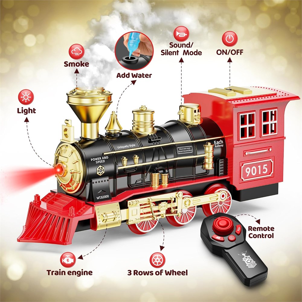 Upgraded Train Set w/ Remote Controller: This Christmas train set includes a remote controller , a locomotive steam engine, a passenger coach, a coal car, a cargo vehicle, 8 curved tracks and 2 straight tracks. the full -equipped toy train is driven around the Cristmas tree. Not only can you keep your kids having fun for hours but also improve their intelligence and exercise hand-eye coordination Easy to Set Up, Play and Kid Friendly Design: Children can assemble the upgraded rail track parts into their own railroad layout firmly and easily (circular and oval layout), then place the boy train toys hooked on the tracks precisely, finally turn on the switch, the Christmas tree train will progress steadily on the train tracks Safe, Durable & High Quality: This toddler train set is made of durable ABS, non-toxic materials. And each component is subject to strict quality control to ensure impact resistance and durability. Make sure your family deserves a fun and safe experience. You can set the track around the bottom of the Christmas tree or other spots Perfect Christmas Toys Gifts for Kids: This kids model train toys is a meaningful gift for every child. During the holiday season, you can also place the train under the Christmas tree to add a festive atmosphere. These are perfect birthday/Christmas toy gifts for 5 6 7 8 9 10+ year old boys/girls Remote control -frequency operation: 1. First, Long press the remote control -light flashing. 2. Then turn on the train power supply -the front lights flash, and the two sounds of "drip" are successfully paired. (The headlights on the front are always bright, and the remote control lights go out). 3. After the frequency is successful, press the power button again to start the train.