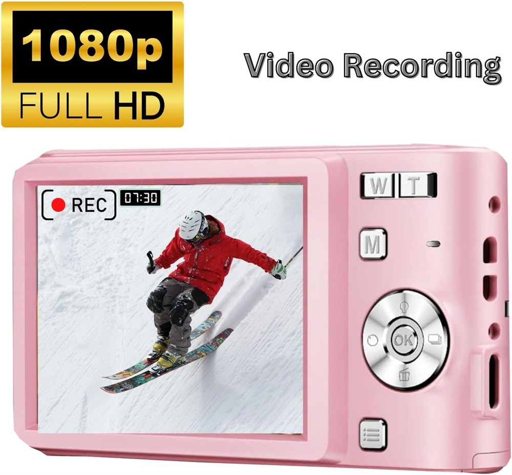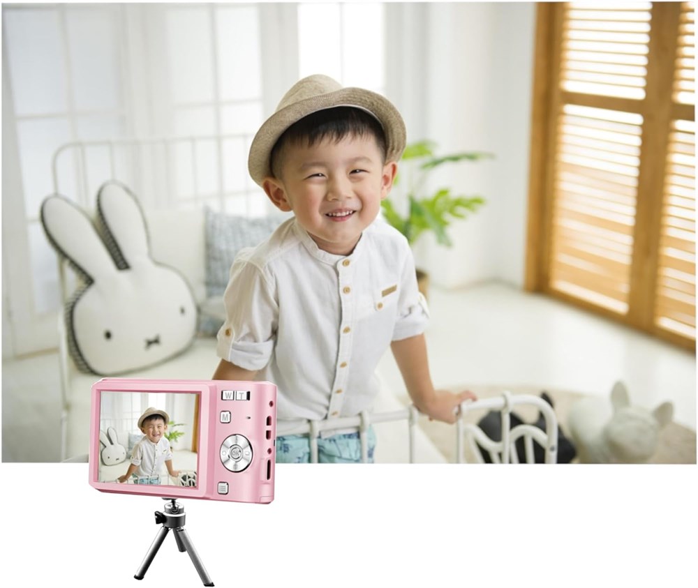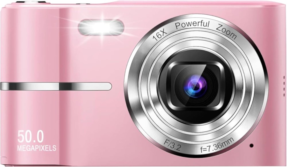 MULTI-FUNCTIONAL: Supports digital photography and video recording. The upgraded 50MP optical lens allows you to take vibrant photos. With a video resolution of 3656 x 2664, use it as a camcorder to record HD videos and movies COMPACT & SLEEK. The mini digital camera is portable and lightweight (weighs only 0.4lbs), making it convenient to take with you anywhere you go. It sleek design gives it an elegant and modern look EASY OPERATION: The menu is easy to navigate and the setting easy to adjust, which makes it the ideal digital camera for kids (whether 3-5 years old or 10-12 years old), for students, and for those who are new or exploring with digital photography. Also makes for a perfect gift for friends and loved ones DURABLE: Encased in high quality plastic material, the camera can resist physical damage. So, no worries if kids accidentally drop it on a hard surface DISPLAY & CONNECTIVITY: Features a 2.4 inch LCD display which allows you to view photos and videos in playback mode. Use the USB cable (included) EXPANDABLE MEMORY. The 32GB (included) provides plenty of space to store thousands of photos and short videos (the camera can support from 4GB to 128GB memory card) POWERFUL BATTERY: Two rechargeable lithium batteries. Each one can support up to 3 hours of continuous use, allowing plenty of time to capture and record your fun moments OTHER FEATURES: 16X digital zoom, autofocus, self timer, anti shake, continuous shooting and a built-in flash that supports photo shooting and video recording under various conditions, including low light and nighttime IN THE BOX: Digital camera, USB cable, 32GB memory card, 2 lithium batteries, pouch, and wriststrap.