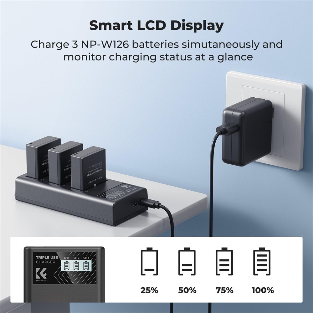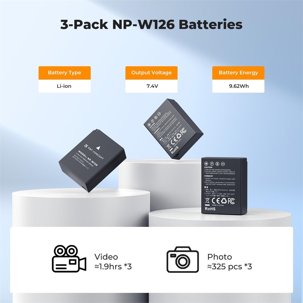 Compatibility: NP-W126S Rechargeable battery is fully compatible with Fujifilm X100VI, X100V, XT30II, XT50, XT30, XT20, XT10, XS10, X-T1, X-T2, X-T3, X-Pro1/2, XE4, XE5, X Half camera. High Capacity: 3 Pakc NP-W126S battery have larger capacity 1300mAh 9.62Wh, charging without memory effect, Triple the battery life for your journey, for long duration videos and photography. Multiple Charging Options: NP-W126S NP-W126 support 5V power source with USB-C and Micro B input. can be charged with laptop, wall charger or car charger . Convenient charging options provide flexibility for on-set and on-the-go charging. 3-slot LCD Charger: It can charge 3 batteries at the same time, the smart LCD charger clearly displays the battery capacity, allowing you to quickly judge the battery status, know the charging status at any time. Safe & Portable: The charger provides over-voltage protection, over-current protection, short circuit protection, high-temperature and over-charge protection.