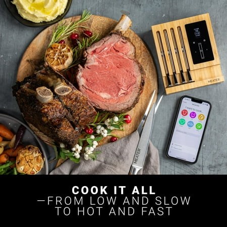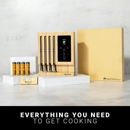 Longer Range: With built-in Bluetooth to WiFi range extension, you can keep tabs on your food from anywhere in your home. And if you prefer to cook without your smart phone, our Stand-Alone Mode has got you covered. Four Probes: Each probe features dual temperature sensors, allowing you to monitor both the internal meat temperature (up to 212 F) and the ambient/external temperature (up to 527 F) simultaneously. Each probe has dual sensors that measure the internal temperature within +/- 1 F. Guided Cook System: Our step-by-step system will guide you through the cooking process, ensuring that your food is cooked to perfection every time. You can also set up custom alerts and notifications based on temperature and/or time to keep you on track. Advanced Estimator Algorithm: Take the guesswork out of meal planning with free MEATER app algorithm, which estimates the ideal cooking and resting times for your food. Convenient Power Source: MEATER Block features a Micro-USB port, which allows you to power it without the need for AA batteries. Please note that the Micro-USB connection does not charge AA batteries, and the Micro-USB cable is not included in the package. Bamboo Block Charger: The stylish bamboo block not only holds your MEATER probes but also serves as the charger, ensuring your wireless meat thermometer is always ready for use. To help you get started right away, four probe clips are also included in the package.