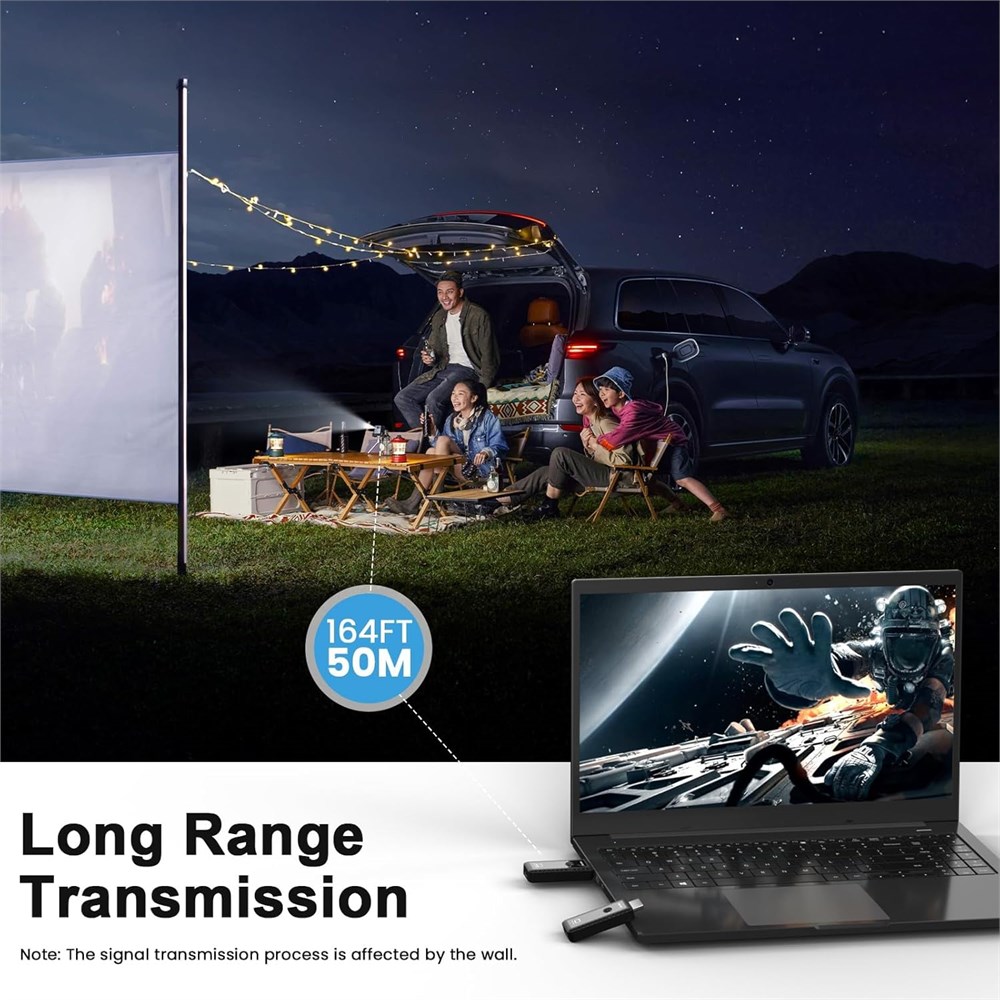 Wireless Screen Mirroring and Extension Modes Offer support for screen mirroring and screen extension capabilities, enabling the projection of content from various devices such as laptops, cameras, and cable set-top boxes onto HDTVs, projectors, and monitors for a versatile application experience. Additionally, the HDMI Wireless Extender features a 20% reduction in size compared to traditional USB-style products, making it highly portable and convenient to carry. 4K Decording 1080P HDMI Out The Wireless HDMI Transmitter and Receiver can stream 1080P@60hz video and audio to big display with nearly no delay, offering exceptional visual experiences for learning, business meetings, family gatherings. Plug and Play, Faster to connect No need for complex applications, Bluetooth, or Wi-Fi connections; Require no WiFi, Bluetooth or APP. You can easily cast anything to a larger screen in less than 10s without using HDMI cables. keeping your room or office neat.Say goodbye to messy cables and enjoy seamless, high-quality streaming. 164 Feet/50 Meters Wireless Transmission Long-Distance Transmission, Stable Connection: With 2.4G/5G dual-frequency transmission, enjoy stable connectivity up to 50 meters away. Whether for meetings or leisure, experience uninterrupted audiovisual freedom. (Note: Transmission distance and speed may be affected when the product passes through walls or encounters obstacles.) Note, if your computer lacks power or cannot supply power to HDMI port, please plug the Transmitter and Receiver power into an adapter or micro power interface (5V/1A).