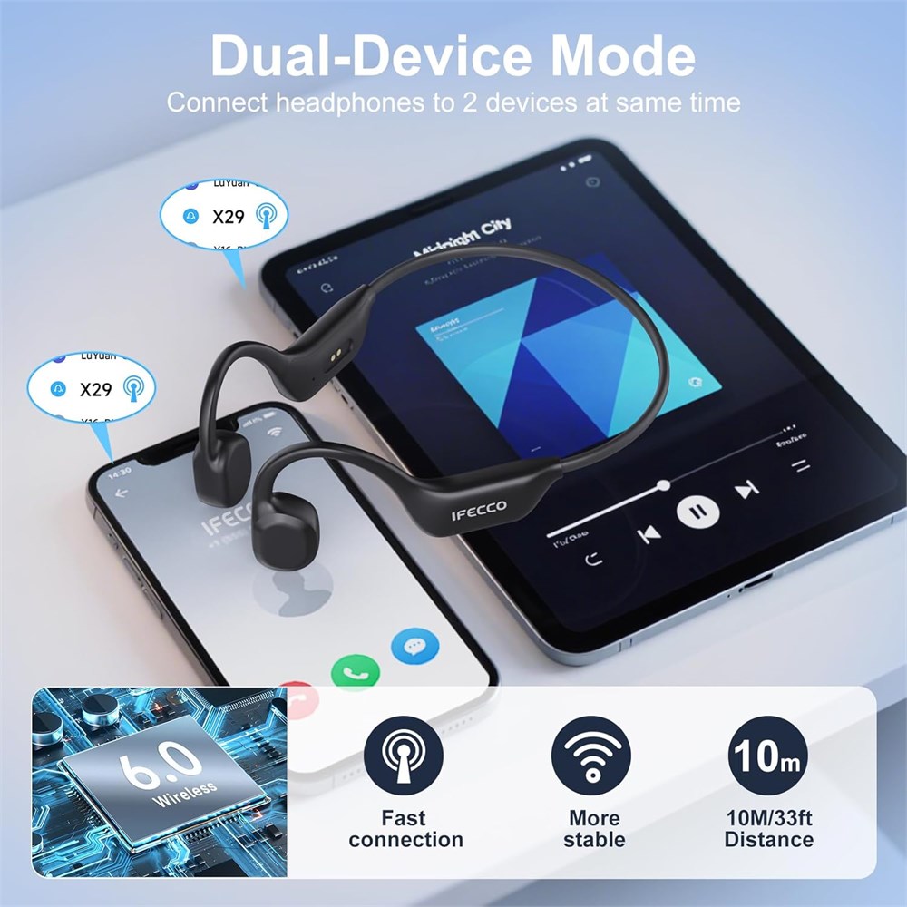 Sports Headphones with Bone Conduction Technology: Total Safety and Comfort. Enjoy your music and stay aware of your surroundings.These running headphones use bone conduction technology, so they don't block your ears.They are ideal for safe running or cycling,allowing you to hear traffic and ambient sounds with total clarity. IP67 Water Resistance: Perfect for Sports and Sweat.These bone headphones are built for the most demanding workouts.With an IP67 rating,they resist intense sweat and water splashes.Whether you're running in the rain or during an intense training session,your music won't stop. Advanced Bluetooth 6.0 Connection and Multi-Connectivity: Experience a stable,low-power connection with the latest Bluetooth 6.0 technology. Furthermore,these bone conduction earbuds allow you to connect to two devices simultaneously,like your phone and computer,and switch between them seamlessly.Perfect for daily use and training. Up to 10 Hours of Battery Life: For Your Longest Workouts. Forget about constantly charging your headphones.With a long-lasting battery of up to 10 hours, these running and workout headphones will accompany you on your longest sessions,be it a marathon,a long bike ride,or a full day of activity. Music Mode and Game Mode: Versatility for Your Entertainment. They are not only the best sports headphones,but also versatile for leisure. Switch to Game Mode for a synchronized, low-latency audio experience while gaming, and switch back to Music Mode for immersive sound on your runs.