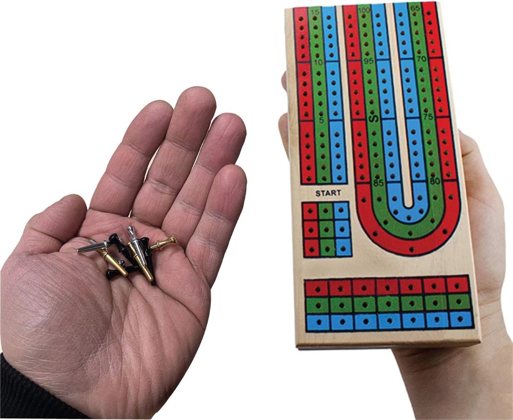 Board Details: Genuine Wooden Folding Cribbage Board, Dimensions: 14.25 inches (37cm) by 3.5 inches (8cm) Traditional 3-track design, Folded dimensions: 7.25 inches by 1.5 inches by 3.5 inches, Comes with 9 plastic pegs Folding Cribbage Board: When Folded it measures 7.25 inches (18cm) by 1.5 (4cm) inches by 3.5 (8cm) inches. Premium Pegs: Bonus Premium Metal Replacement Cribbage Pegs, Total of 9 pegs included (3 Black, 3 Silver, 3 Brass) Convenient Storage: Wooden board features a plastic storage compartment for pegs on the back Ideal for on-the-go gaming or easy storage until the next play session Playing Cards Included: 1 pack of Playing Cards with Standard numbers (Poker Size 2.5 )