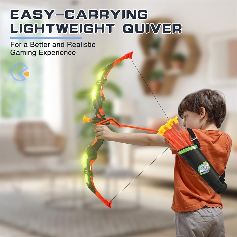 Enhance Focus and Coordination These youth bow and arrow set provides an engaging and challenging activity that helps children develop essential skills not only just aiming and shooting, but also promotes focus, patience, and hand-eye coordination via the most fun and interactive way. They will learn to concentrate, improve their aim, and develop a sense of discipline while enjoying the excitement of hitting targets. Safe for Kids & Easy to Use Equipped with soft suction cup tips, the arrows can be firmly attached to the target or glass smooth surface. Such a brilliant design making it an ultra safe toy for kids aged 3 and above. Besides, the bow is lightweight and easy to handle, ensuring a comfortable grip for small hands. The built-in LED lights of the bow making it a cool toy as well as perfect toy for children to enjoy in rooms with low light or in dark environments (note: batteries are not included). Durable & High-Quality Made Made from durable materials, youth archery bow is designed to resist impact and provide long-lasting performance. The adjustable string design of the toy bow enhances its versatility for users of different ages and body types, providing improved safety and control as well as boosting the overall durability and long-lasting quality of the entire set. The arrows are meticulously crafted with precision, featuring robust shafts designed for prolonged and repeated use. Durable & High-Quality Made Made from durable materials, youth archery bow is designed to resist impact and provide long-lasting performance. The adjustable string design of the toy bow enhances its versatility for users of different ages and body types, providing improved safety and control as well as boosting the overall durability and long-lasting quality of the entire set. The arrows are meticulously crafted with precision, featuring robust shafts designed for prolonged and repeated use. Portable and Easy-Carrying These archery sets include 2 bows, 20 arrows, 2 quivers, and 1 standing target. With their compact size and lightweight construction, they are designed to be effortlessly carried and transported. Whether you're planning a trip to the park, going on camping adventures, or enjoying family outings, these archery sets are the ideal companion. Encourage your young archer to explore new environments and discover the joy of archery wherever they go. Outdoor/Indoor Fun & Perfect Gift Comes with a standing target that can also be hung on the wall, these archery set is an excellent choice to enjoy both outdoor and indoor fun by placing it on backyard, garden, camping area, playground, living room, game room, archery field. It is an brilliant gift choice for boys, girls, kids, your son, daughter, nephews on various occasion like Birthday, Halloween, Thanksgiving, Christmas, etc, or reward for good behavior.