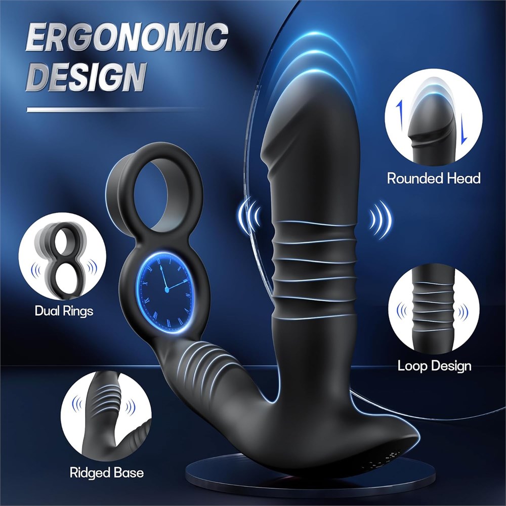 3 in 1 Versatile Anal Sex Toys Specially designed with anal plug, prostate massager and double cock ring in one, this male sex toys for men's sex provides you multi pleasures. The anal toys rock your P spot with stimulation internally, and the raised base hits the perineum externally. The double cock rings are added for more pleasure. All 3 together bring you multi pleasures. sex toys for men,anal toys 7 Strong Thrusting &7 Vibrating Modes Featuring deep thrusting modes and rumbly vibrating modes in 7 intensities, these adult anal toys ensure varied enjoyment internally and externally. Available in 7 different thrusting vibrator modes, these sex toys for men give you more choices to find your favorite rhythm, bringing hours of fun for you.adult toys,sex toy catheters & sounds Ergonomic Design for Precise Stimulation The shape of prostate massager sex toy adopts a T-shaped design, which fits your body perfectly. The head of anal plug offers a sensation while the ribbed portion on the shaft will enhance the pleasure of friction. The raised ridge sends precise stimulation, and the vibrating cock ring allows for prolonging "happy time". The butt plug adult toys hit all spots with precision to provide the entire range of stimulation Fits More Sizes & Multifunctional Anal Toys Perfect in size and unique in design, this prostate massager is available in different sizes, from the first try to anal enthusiasts. The super-stretchy and elastic silicone ring is contoured for a comfortable fit, no matter how big is your size. Besides, this vibrator is also can as a G spot stimulators to please your partner. This is the perfect in-between mens sex toy for all needs Premium Silicone & Waterproof Firm yet flexible, this anal thrusting dildo is made of premium body-safe silicone, silky odorless, and hypoallergenic. The sleek feeling of sex toys for men is enjoyable to enhance your experience. Adding Water-based lubricant ensures smooth sensation and gets better enjoyment. This anal vibrator is waterproof, easy to clean, and perfect for enjoying in the bath or shower Discreet Packing & USB Charging This anal plug adult sex toys & games has a cable included, charging for 120 minutes to enjoy up to 60 minutes.