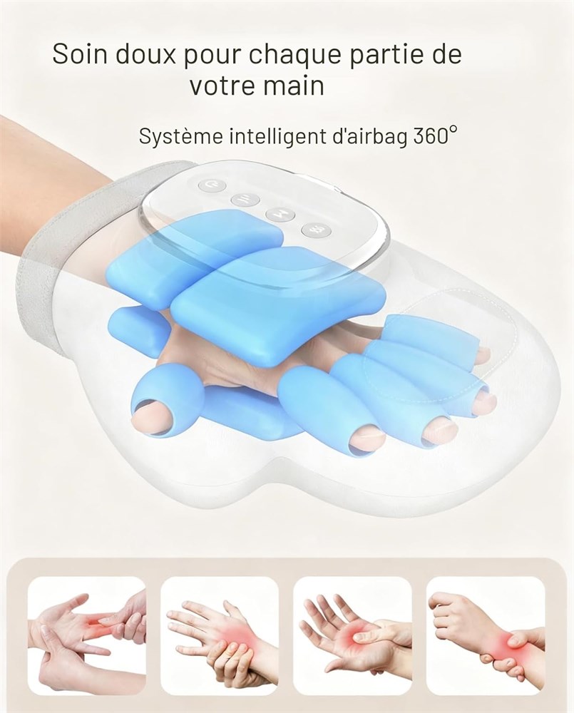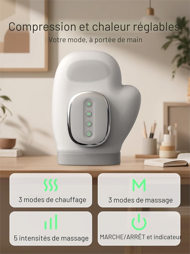 Masseur de mains professionnel : le chauffe-mains est quip de 13 airbags en TPU, 3 modes de massage (sant /apaisant/vitalit ), 3 modes de temp rature (45 C/50 C/55 C), 5 intensit s de compression, chauffage rapide de 8 10 secondes, minuterie d'arr t automatique de 15 minutes. Design 5 doigts personnalis : Notre masseur pour les mains et les doigts a un design unique de gant qui offre un soin d di et un massage des mains avec les cinq doigts individuellement id al pour un soulagement personnalis des mains fatigu es avec la machine masser les mains. Masseur de main portable et sans fil pour la relaxation tout moment, n'importe o : rechargeable et sans fil, batterie au lithium d'une capacit de 2000 mAh, longue dur e de vie, interface de charge rapide de type C, ce masseur de main offre 100 120 minutes d'utilisation apr s une charge compl te en environ 1,5 heure, selon l'intensit de votre pr f rence, ce masseur l ger est facile transporter. Profitez de massages des mains la maison, au bureau, ou m me pendant les voyages sans tre attach une prise de courant. Temporisation intelligente et nergisation continue : chauffage rapide de 8 10 secondes, minuteur scientifique avec un temps de massage par d faut de 15 minutes, jusqu' l'arr t automatique, pas besoin de s'inqui ter d'un massage excessif, cela assure la s curit et pr vient la surchauffe, d tendez-vous simplement les mains et profitez, il suffit d'appuyer sur les boutons mode/vitesse pour personnaliser votre exp rience de relaxation. Cadeau id al : cette machine de massage pour les mains est adapt e la fois la main gauche et la main droite en la retournant simplement. Le design ouvert vous permet d'ajuster votre main la position de massage la plus confortable. Ce masseur chauffant pour les mains est le choix parfait pour les femmes, les hommes, les mamans, les papas, les pouses, les maris, les travailleurs informatiques, les pianistes et les femmes au foyer ou les parents g s de tous ges pour la Saint-Valentin, un anniversaire, la f te des m res, la f te des p res et No l.
