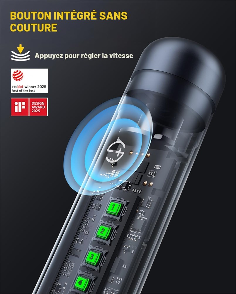 Puissant et silencieux : Le Fanttik F2 Master est dot d'un moteur brushless coreless efficace qui r duit le bruit de 30 % par rapport aux moteurs balais traditionnels. Vitesse maximale : 25 000 tr/min, elle offre des performances plus fortes et moins de chaleur. 5 r glages de vitesse ajustables facilitent la gestion de diverses t ches de pr cision Revostor Hub : plus besoin de chercher des pi ces jointes Le F2 Master est dot d un support magn tique rotatif 360 avec 35 accessoires organis s (2,3 mm), rendant les t ches de bricolage comme le meulage, le polissage, le per age et la gravure faciles et pratiques Mini et portable : ne pesant que 0,22 lb, son design l ger est parfait pour la cr ativit en d placement. Le bo tier en aluminium durable r siste la rouille et pr sente un design ouverture rapide d un clic pour un acc s rapide et facile l outil l gant et pratique : bouton de contr le de vitesse int gr sans couture, tanche et r sistant la poussi re pour un nettoyage facile, adaptable n'importe quel environnement de travail. Indicateur de vitesse LED innovant qui affiche les param tres en temps r el pour un fonctionnement pr cis chaque tape Chargement USB-C : le port universel de type C se charge compl tement en 60 minutes. Un indicateur d'alimentation arri re devient rouge en dessous de 30 %, vous gardant inform et sans souci. La lampe LED avant offre un soutien suppl mentaire pour les t ches de bricolage.