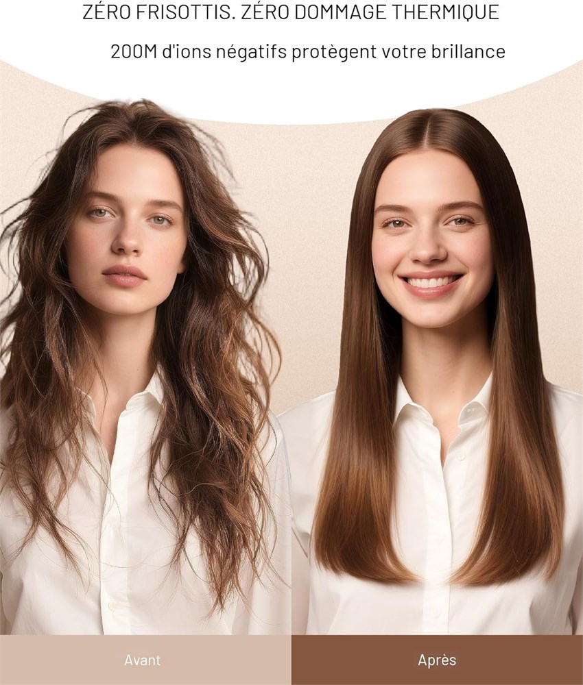 DOUBLE TENSION MONDIALE POUR VOYAGER GRATUITEMENT : Notre s che-cheveux double tension s'adapte automatiquement aux tensions locales (100-120 V/220-240 V), aucune commutation manuelle requise, offrant une performance fiable et puissante partout o vous allez Am rique, Europe, Asie ou Australie. (Remarque : un adaptateur de prise peut tre n cessaire en fonction de votre destination.) S CHAGE VITESSE PROFESSIONNELLE : Dominez vos matins charg s. Notre s che-cheveux professionnel haute vitesse est quip d'une puissance de 2000 W et d'un moteur sans balais haute vitesse de 110 000 tr/min, vitesse du vent jusqu' 26 m/s, 10 fois plus rapide qu'un s che-cheveux traditionnel. S chez vos cheveux longs en seulement 5 minutes le matin charg , vous faisant gagner du temps sur le coiffage S CHE-CHEVEUX PORTATIF ET SILENCIEUX : Dites adieu aux s che-cheveux encombrants et bruyants. Notre s che-cheveux de voyage est compact et l ger, seulement 0,88 lb, parfait pour se glisser dans vos bagages ou votre sac, occupant un minimum de place pour un confort ultime lors de vos d placements. Ce s che-cheveux ionique fonctionne un faible niveau sonore inf rieur 59 dB (ne d range pas les autres), apportant confort et praticit vos voyages CHEVEUX SANS FRISOTTIS ET BRILLANTS : Con u avec 200 millions d ions n gatifs haute p n tration, ce s che-cheveux ionique scelle uniform ment les cuticules, pour une brillance naturelle, lisse, soyeuse et durable. Que ce soit la maison ou en voyage, vous pouvez facilement cr er des cheveux impeccables et brillants. Avec plusieurs r glages de chaleur au choix et un contr le intelligent de la chaleur, vous pouvez personnaliser votre exp rience de s chage en fonction de votre type de cheveux sp cifique Design compact et l ger : ce s che-cheveux double tension ne p se que 0,4 kg, occupant un minimum de place dans votre valise pour un confort ultime lors de vos d placements. Que ce soit pour un voyage d'affaires, des vacances ou des tudes l' tranger, cette brosse s che-cheveux double tension vous assure une exp rience de s chage des cheveux confortable. (Les dimensions du produit sont de 19,6 x 19,6 x 4,3 cm, la longueur du c ble est de 2,3 m) Le cadeau attentionn et pratique que tout le monde aime : mettez fin la recherche du cadeau parfait. Ce s che-cheveux ionique combine les caract ristiques les plus recherch es : une puissance lev e, une double tension, un fonctionnement silencieux et un design l ger et compact, le tout dans un emballage magnifique. C'est plus qu'un simple s che-cheveux de voyage ; c'est un cadeau de luxe quotidien, de commodit attentionn e et de r sultats de qualit professionnelle la maison. Un cadeau vraiment appr ci pour votre maman, pouse, s ur ou amie en toute occasion sp ciale.