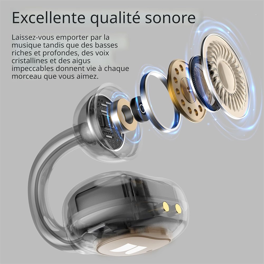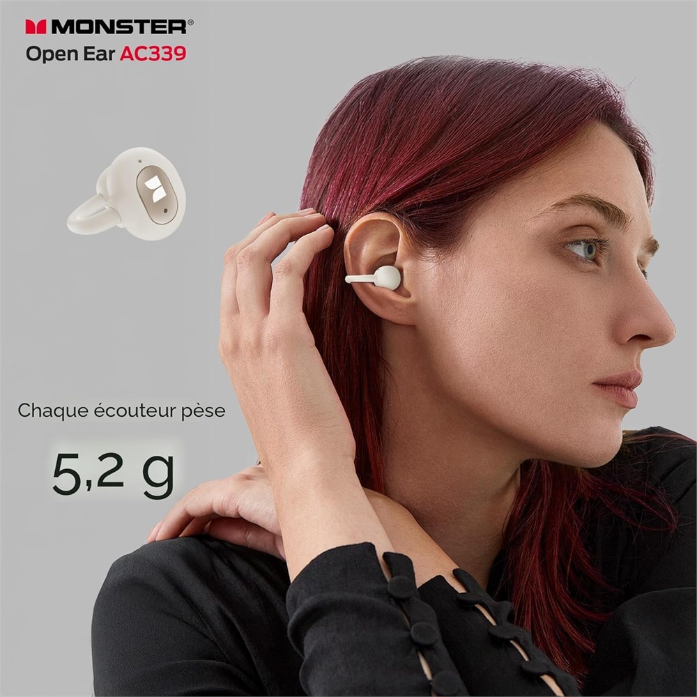 Audio de qualit sup rieure et confort extr me : ces couteurs ouverts offrent une exp rience de port extr mement confortable avec leur design pince, assurant un ajustement parfait sans pression suppl mentaire. Associ s un son de haute qualit , ils offrent un son clair et immersif, rendant chaque session d' coute agr able et sans effort. Contr le tactile multifonction Monster Open Ear AC339 est sp cialement con u avec une fonction de contr le simple, vous permettant de basculer facilement entre r pondre et raccrocher des appels, assistant vocal, contr ler la musique et g rer d'autres fonctions avec juste une touche. Que vous conduisiez, faites de l'exercice ou courez, cela offre une grande commodit et s curit . tanch it IPX6 : ces couteurs ouverts sont r sistants l'eau IPX6, les prot geant des jets d'eau puissants de toutes les directions. Cela les rend parfaits pour toutes les conditions m t orologiques ou les entra nements intenses, o l'exposition la sueur et l'eau sont courantes. Autonomie de la batterie ultra longue : jusqu' 40 heures de lecture continue, assez pour 14 jours d'utilisation quotidienne (1 2 heures/jour). L' cran num rique int gr affiche instantan ment le pourcentage exact de la batterie, de sorte que vous n' tes jamais pris au d pourvu.
