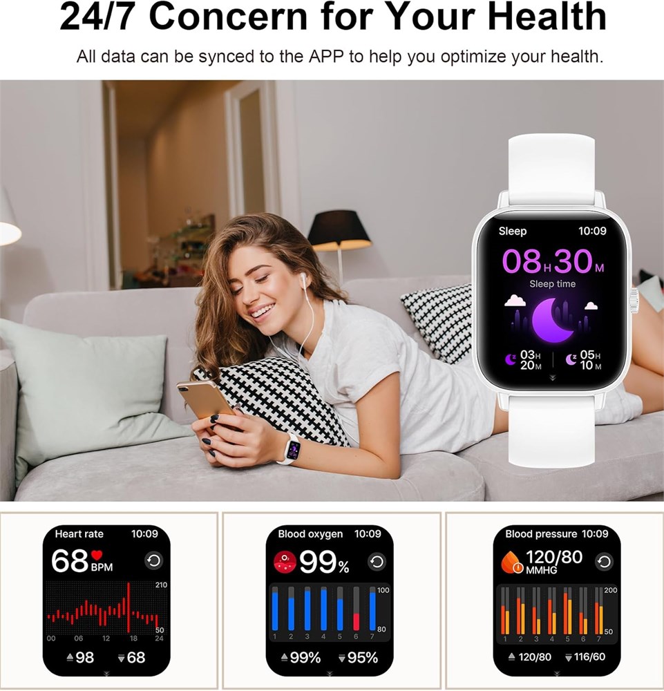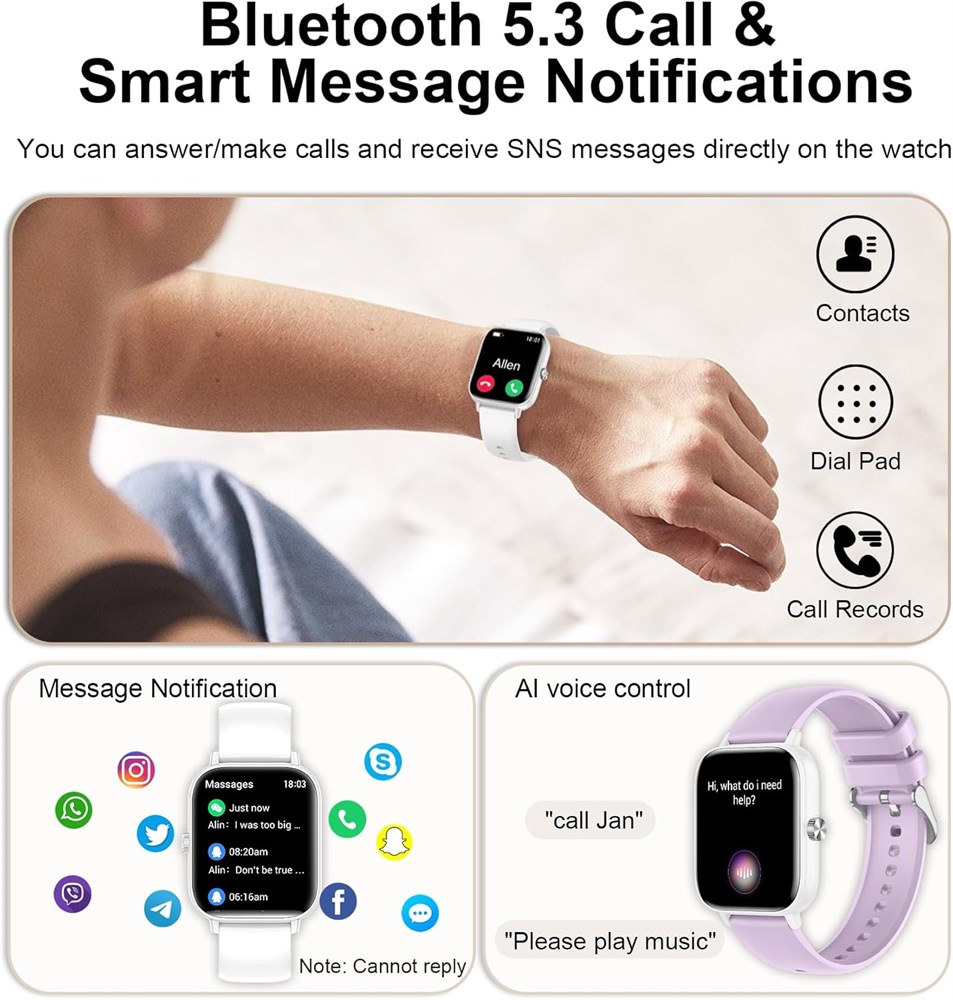 Calling & Message Alerts & AI Voice Assistant With Bluetooth connection, you can answer/make calls on the smartwatch anytime, anywhere. It also supports information reminders (text, Facebook, WhatsApp, Instagram, Twitter, etc.) Read at any time on your wrist so that you will not miss important message notifications. (Note: Cannot reply). The smartwatch for women can also operate the phone's AI voice assistant, such as Sir Assistant. Personalized Smartwatch 1.83' HD full touch screen with excellent picture quality. 3 watch bands (white silicone, Lavender silicone, and white small hole silicone)Let you have more fashion. There are a variety of dials in the APP to switch at will, and you can even customize your watch faces with your favorite photos (your family, friends, pets) from the app. This digital watch for women supports multiple languages. 120+ Sports Modes Activity Tracker Featuring innovative activity trackers and smartwatches. The smartwatch for women can monitor and record exercise calories, distance, steps, time, and heart rate. The fitness tracker watch supports 120+ sports modes: running, climbing, jump rope, yoga, cycling, football, basketball, etc. (In addition to the built-in 8 commonly used modes, you can select through the APP) IP68 waterproof smart watch, lets you sweat without worry.NOTE: not suitable for diving, sauna, seawater, or hot water. Health Monitoring & Sleep Tracker The Android smart watch can continuously monitor your heart rate. (Not for medical use). In addition, the sleep tracker automatically monitors (9 pm to 12 am), records, and analyzes your sleep (deep sleep, light sleep, awake). You can view the data on the APP to understand your health status. The smartwatch also has functions such as drinking water reminders, sedentary reminders, and female menstrual cycles. Compatibility & Multifunction The smartwatch is compatible with Andriod 5.0+ and iOS 8.0+, 250mAh capacity battery, charging only takes 2 hours, and can be used for 3-7 days (depending on usage). Betatree women smart watch has many useful functions such as weather information, stopwatch, timer, alarm clock, music player, adjustable brightness, find phone, and more.
