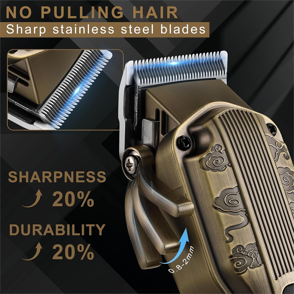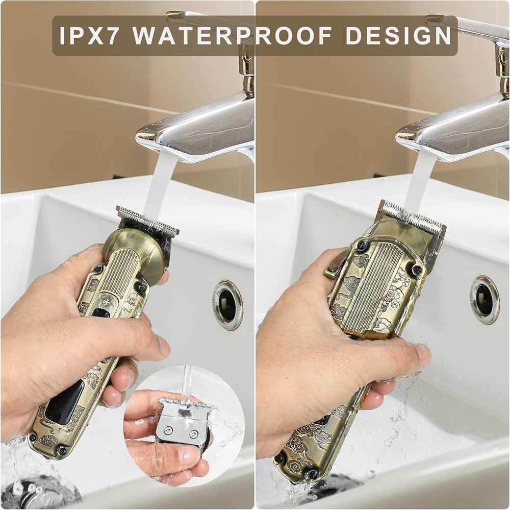 Professional Hair Clipper & Trimmer Kit: This mens grooming kit features a powerful hair clipper and a hair trimmer for achieving all hair styles, it s well fit for professional barbers and home use.All black metal body and exquisite auspicious cloud embossed design, creating a vintage mechanical aesthetic feeling,also it s a good choice for your family on important occasions All in One Men Hair trimmer:The hair trimmer including T-blade trimmer zero gaped precision trimmer,0.1 mm close) beard trimmer, body trimmer, foil head shaver, nose/ear trimmer , which best for beard & eyebrow & manscaping trimming,and four guide combs 1mm 3mm 5mm 7mm .Ideal for slight trims or neatening sideburns and necklines Suitable for Fading & Blending: Men s hair clipper comes with adjustable fade lever(0.8-2 mm)-which are great at doing fades and getting lines out, and includes twelve guard combs, allowing you for blending and precision length trimming without pulling hair. Stainless steel blade increasing sharpness and durability during fading and blending Rechargeable and Cordless:Equipped with durable motors, our trimmer kit can provide long-lasting running for you: Hair clipper takes about 1.5 hours fully charge to allow 150 minutes working time; Hair Trimmer support 180 minutes running after charged with 1.5 hours;The cordless design making it easy to take with you wherever you go Wholebody waterproof: The trimmer kit is fully washable because of its IPX6 waterproof level. All attachments are detachable, use the cleaning brush to clean the blade first after trimming, and then rinse it under tap for quick cleaning. For better storge suggest to add a few drop lubricating of oil to the blade after drying it, finally cover protective caps Smart LED Display: The LED display reminds you of the battery power level, you'll always know how much power you have left, motor speed mode display(6000/6500/7000 RPM adjustable mode for hair trimmer), cleaning reminder and travel lock are more intelligent. The travel lock ensures travel safety without worrying about accidental battery consumption in business travel.