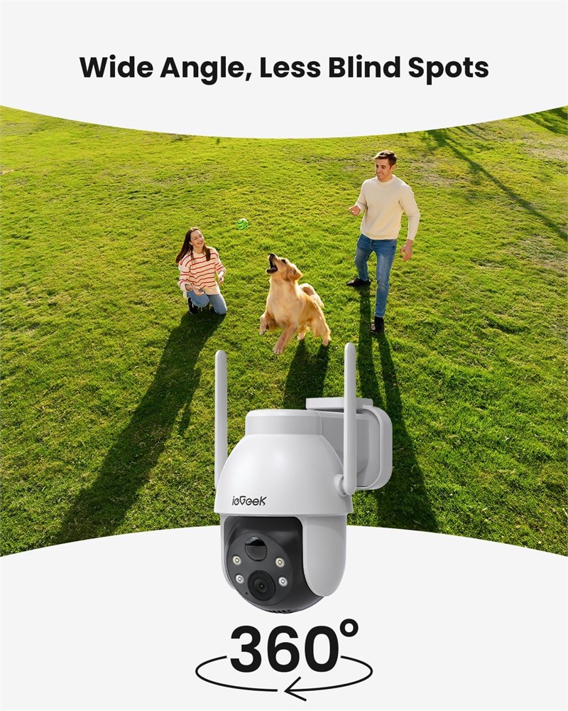 Solar Powered & 100% Wire-Free This solar powered security camera is equipped with a high conversion rate solar panel and rechargeable battery to provide uninterrupted power for the wireless security camera, ensuring stable operation for 365 days. Built-in 4DBI Dual Antenna and Supports 2.4Ghz WiFi only, providing stable connectivity and range(Not support 4G/5G, Not Need SIM Card). 100% wireless eliminates the hassle of frequent charging and wiring installations. Easy to Install & Multifunctional App With a bracket optimized for easy mounting with just 2 screws, this iegeek security camera can be set up and walked down a ladder in less than 10 minutes. This home security camera also supports ceiling and wall mounting to meet your mounting needs in scenarios such as yard eaves, backyards, garages, and more. Our customized "ieGeek Cam" APP has a simpler, more intuitive interface and works with Alexa that parents can also use easily. 2K Full Color Image & 360 View The outdoor security camera is equipped with the latest CMOS technology and 3MP high pixel, which provides 1.5 times more detail than traditional 1080p cameras. Built-in 2 IR lights and 2 white lights provide you with clearer color night vision. Security camera outdoor with 355 pan, 120 tilt, and 4x digital zoom capability (no auto-tracking), provides 360 surveillance of any corner to secure cars, yards, and other properties. Smart PIR Motion Detection & Two-Way Audio The wireless outdoor security camera is equipped with advanced PIR motion detection technology that supports customized motion zones and scheduled alert plans to reduce false alarms by up to 90%. When motion is detected, it instantly sends alert notifications, records alert videos, activates alert sounds and spotlights, and can use the built-in speaker and microphone to keep unwanted visitors out and give you peace of mind. Multiple users Access Control & IP65 Waterproof Easily share the outdoor wireless security camera with your families or friends just with a QR scan. All video from cam ra de surveillance is encrypted and no one will get it without your permission. IP65 waterproof design can completely prevent dust and splash water from entering. The surveillance cameras can work flawlessly outdoors, regardless of heavy rain or sun exposure. The standard operating temperature should be from -4 F to 140 F.