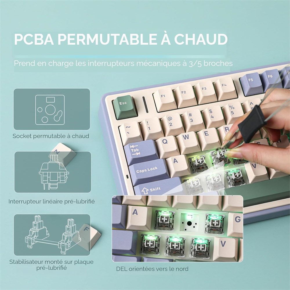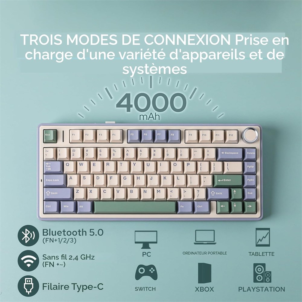 Disposition compacte optimis e 75 % et structure de joint innovante : le F75 red finit l'efficacit de l'espace avec sa disposition compacte 75 %. Ce design int gre toutes les touches essentielles dans un encombrement r duit, ce qui le rend parfait pour les bureaux simplifi s et les configurations mobiles sans sacrifier la fonctionnalit . D couvrez le summum du confort avec la structure du joint. Ce mod le avanc garantit une exp rience de frappe flexible mais ferme, ce qui r duit la fatigue lors d'une utilisation prolong e tout en conservant une sensation de touche coh rente et r active. Ma trise acoustique avec rembourrage cinq couches : le F75 dispose d'un son cinq couches et d'un design interne absorbant les chocs, y compris deux couches de mousse Poron, un tampon de commutation IXPE, un coussinet d'am lioration du son en PET et un coussinet inf rieur en silicone. Cette construction sophistiqu e r duit consid rablement le bruit de frappe et la r sonance, offrant un environnement de frappe calme et cibl . Circuit imprim de 1,2 mm con u avec pr cision et commutateurs m caniques pr -lubrifi s : au c ur du F75 se trouve un circuit imprim fente cl unique de 1,2 mm m ticuleusement con u. Cette ing nierie de pr cision garantit que chaque frappe est enregistr e avec pr cision et stabilit , offrant une exp rience de frappe satisfaisante et fiable. Le FF75 dispose galement de commutateurs m caniques lubrifi s en usine qui offrent un actionnement fluide. Ce processus de pr -lubrification garantit une frappe fluide et constante d s le d but. Connectivit trois voies pour chaque sc nario et batterie de 4000 mAh : offrant Bluetooth, sans fil 2,4 GHz et connectivit USB filaire, le F75 s'adapte vos besoins sp cifiques. Que ce soit pour une configuration sans fil encombr e ou une connexion filaire stable, ce clavier est pr t pour toutes les situations. quip d'une grande batterie de 4000 mAh, le F75 offre des temps d'utilisation prolong s. Cette capacit de batterie g n reuse garantit que votre clavier est toujours pr t pour de longues sessions de travail ou des marathons de jeu intenses. Bouton de commande multim dia et fonctionnalit d' change chaud compl te R glez sans effort vos param tres multim dia l'aide du bouton de contr le multim dia int gr , ajoutant une couche de commodit qui garantit des ajustements rapides sans perturber votre flux de travail. Plongez dans un royaume de personnalisation avec les prises compl tes rempla ables chaud du F75. Cette fonctionnalit facilite le remplacement des commutateurs, s'adapte votre sensation de frappe souhait e, que ce soit pour le jeu, la saisie ou les activit s cr atives. Stabilisateurs finement calibr s et touches PBT profil cerise double shot : d couvrez des frappes raffin es avec nos stabilisateurs ajust s avec pr cision, offrant stabilit et une exp rience de frappe silencieuse. Dites adieu l'oscillation des touches car vos frappes gagnent en pr cision. Le F75 fait passer la durabilit au niveau sup rieur avec ses touches PBT profil Cherry, assurant un m lange parfait de robustesse et de design l gant. Ces touches r sistent l'usure, tout en conservant une apparence l gante qui d fie l' preuve du temps. Ultra-r actif faible latence et clairage RVB vibrant de 16,8 M Engagez-vous dans la lueur dynamique du r tro clairage RVB du F75, pr sentant un riche spectre de 16,8 millions de couleurs pour un environnement de frappe personnalis . Personnalisez les motifs d' clairage selon vos pr f rences, cr ant une atmosph re de bureau qui s'adapte votre humeur. Avec sa connexion ultra-r active et faible latence, le F75 garantit que chaque frappe est non seulement clair e de mani re vive, mais galement livr e avec une pr cision rapide et in branlable, que vous jouiez ou tapiez loin.