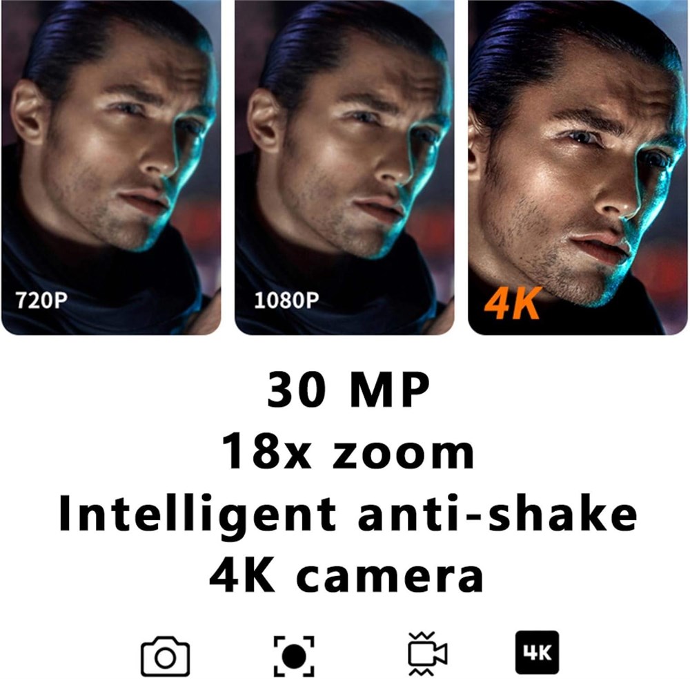 La r solution vid o 4K est 4 fois sup rieure celle de 1080p. cran tactile color de 3", facile utiliser, toucher directement. Il peut tre connect un objectif externe, un objectif grand angle avec une grande ouverture, pour augmenter la port e de prise de vue, et un objectif macro pour prendre des photos courte distance am liore consid rablement la prise de vue d taill e. Anti-tremblement intelligent, pas besoin de vous soucier du flou d'image caus par le tremblement de l'appareil photo. Zoom 18x, avec cam ra haute d finition 4K, la vue loign e peut tre clairement vue. 30 millions de pixels ultracleaires, photographie fixe, quip d'une t l commande pour un contr le facile, pas besoin d'utiliser les boutons sur le corps. D tection intelligente du visage et mise au point, fonction de mise au point automatique am lior e, nouveau syst me de suivi du visage intelligemment et suivi continu du sujet lors de la mise au point, la premi re fois pour reconna tre et capturer l'expression instantan e des personnes, le mouvement Batterie puissante, longue dur e de vie, haute capacit , pleine puissance pour soutenir le cycle de charge de la banque d'alimentation, charge et enregistrement, enregistrement en plein air.