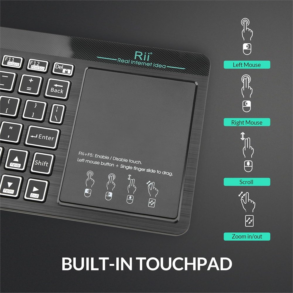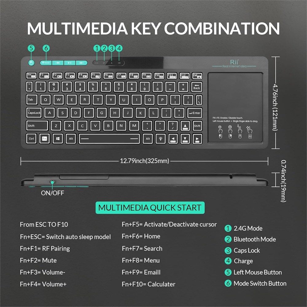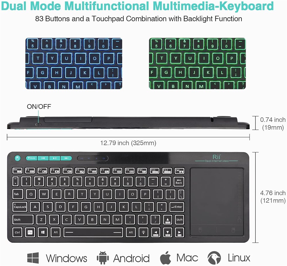 Clavier sans fil 2 en 1 : clavier Bluetooth et clavier sans fil RF 2,4 GHz. Le mode clavier Bluetooth connecte votre TV, PC, ordinateur et autres appareils par Bluetooth et pas besoin d'autres param tres. Clavier sans fil RF 2,4 GHz avec dongle USB. Le mode pourrait connecter vos appareils qui n'ont pas de fonction Bluetooth. Clavier r tro clairage LED Clavier avec r tro clairage bleu et vert, il est pratique lorsque vous devez saisir quelque chose sur le t l viseur dans l'obscurit . Clavier Grand Pav Tactile Clavier avec pav tactile de grande taille, fonction tactile multipoint sensible qui r pond toutes les fonctions de la souris lorsque vous travaillez, regardez la t l vision, zoom avant/arri re avec deux doigts. Compatibilit du syst me : le clavier sans fil peut fonctionner avec Android TV Box, Smart TV, PC, tablette, Android, Windows, Mac OS (certaines fonctions multim dias ne peuvent pas fonctionner sur Mac OS). Dur e de garantie Garantie de 12 mois. Nous fournissons un service client 7x24h. Si vous rencontrez un probl me pendant l'utilisation, nous vous prions d'envoyer un message notre quipe de support et nous vous aiderons en temps voulu.