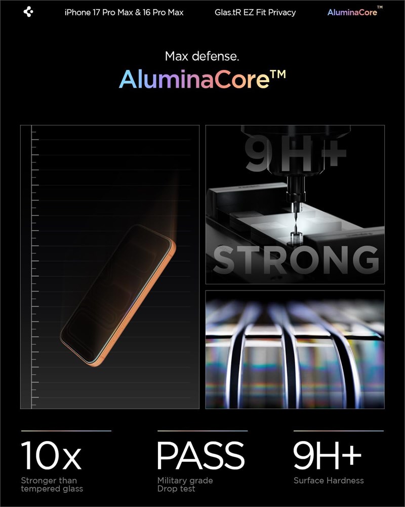 Superior Screen Protection: Made from new AluminaCore glass for the best ultimate screen protector against daily drops and scratches New AluminaCore Technology: High-purity alumina-silicate glass undergoes a ion exchange strengthening process to maximize protection Natural Touch and Clarity: Experience fast touch sensitivity with zero lag and total light transmittance for an ultra clear display Easy Guided Installation: Includes 2 EZ Fit screen protectors and installation kit for quick guided installation Check for Compatibility: Compatible with iPhone 17 Pro Max / iPhone 16 Pro Max and designed precisely to fit in Spigen Cases.