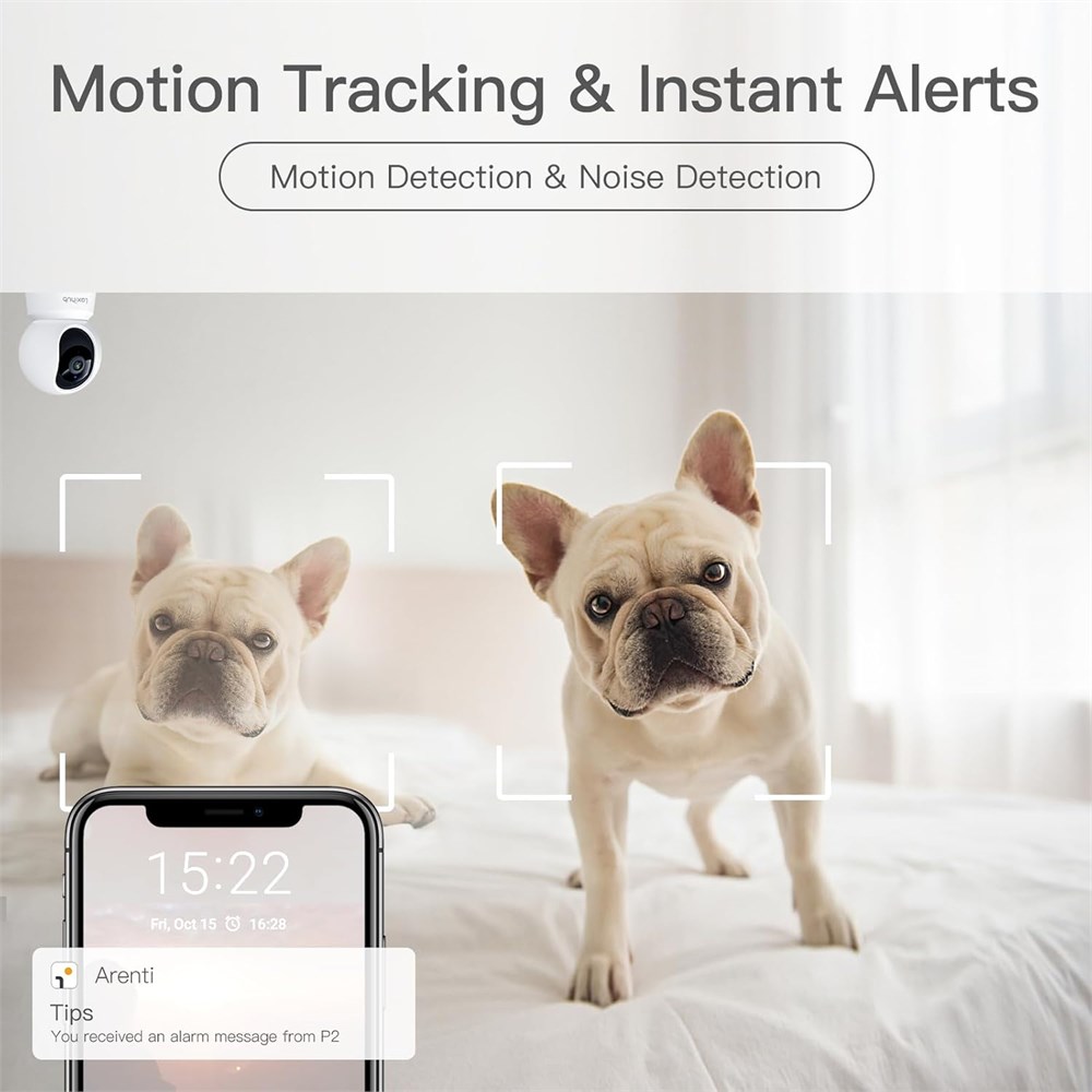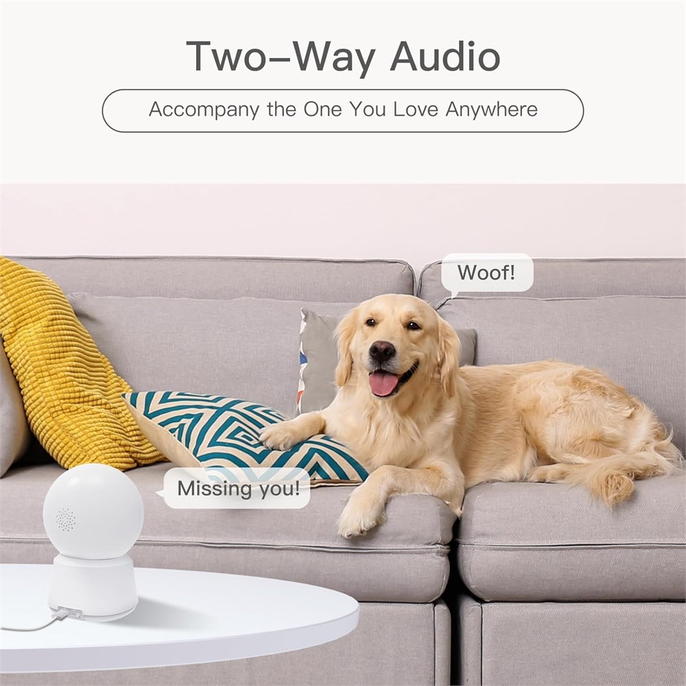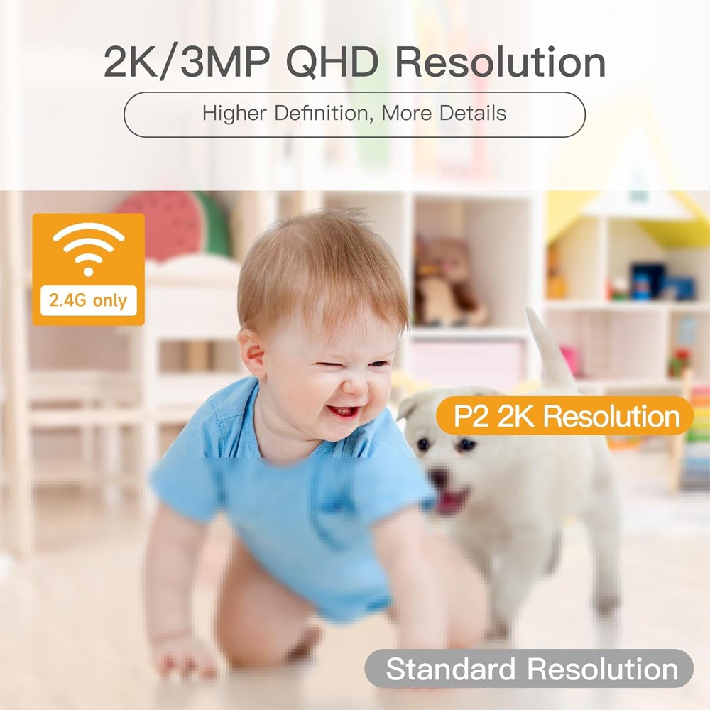 1 - 360 Angle Covered - The P2T wifi camera has a 105 wide-angle enhanced lens, combined with 355 horizontal and 60 vertical rotation range, creating a complete 360 coverage. 2 - 2K/3MP Resolution - 2K/3MP resolution displays a clear video. So you can keep an eye on your home 24/7. 8X digital zoom to enlarge the video to see details clearly. 3 - Smart Motion Tracking - The P2T pet camera supports mobile tracking, manual cruise, and timed cruise, which automatically tracks the motion if detects a pet or a human. 4 - Adjustable Motion & Noise detection - The P2T security camera support motion detection and noise detection. It has three levels of sensitivity for adjustment. 5 - Superior Night Vision - The enhanced night vision mode allows you to see clearly in the dark, up to 32ft/10m. You can see the delicate movements of your little one clearly.
