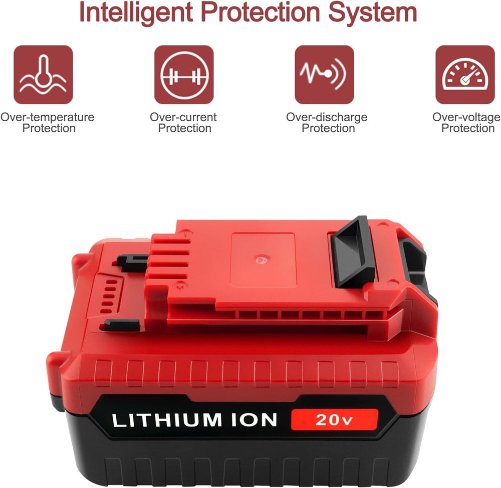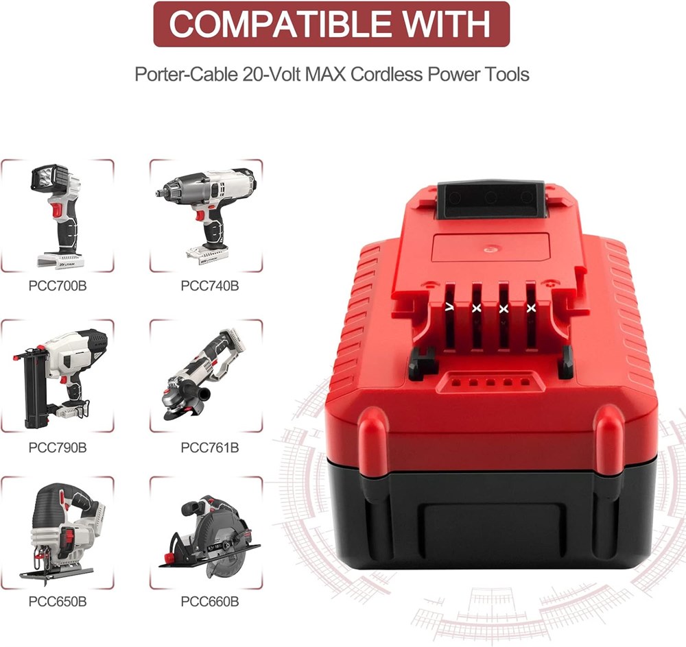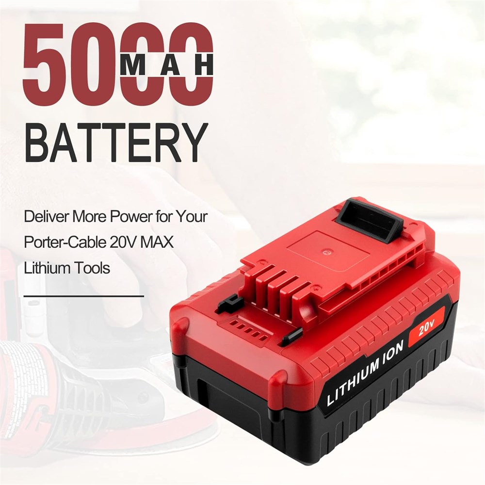 Li-ion | 20Volts | 5000mAh |100Wh | 20 Volts high capacity li-ion battery compatible with all Porter Cable 20-Volt cordless power tools and 20V lithium charger. Professional replacement power tool battery compatible with Porter Cable PCC685L PCC680L PCC681L PCC682L PCC685LP. 5000mAh high capacity lithium ion battery delivers maximum runtime for your heavy duty applications. Easy to install and remove. If you don't plan on using the Power Tool Battery for a month or more, store it in a clean, dry, cool place away from heat and metal objects. Ni-Cd, Ni-MH and Li-ion batteries will self-discharge during storage; remember to recharge the batteries before use.
