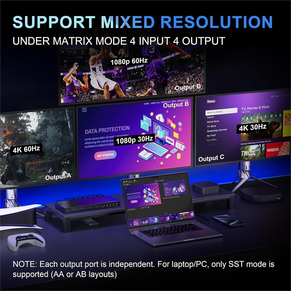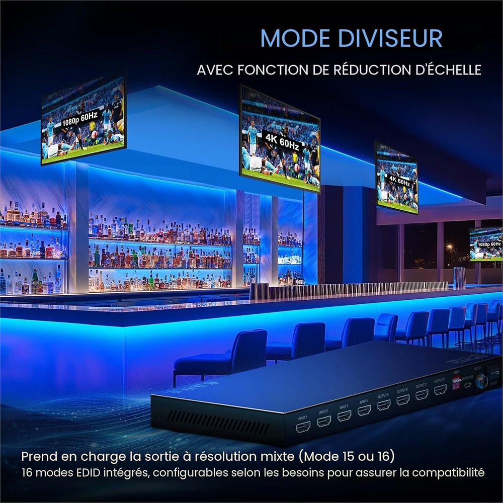 Matrice HDMI 4x4 La matrice HDMI 4K HDR prend en charge une commutation matricielle entre 4 p riph riques d'entr e sur 4 affichages de sortie, les 4 signaux de sortie peuvent tre identiques ou diff rents. Parfait pour les salles de cours, les conf rences, la surveillance de s curit CCTV, les centres de jeux et les expositions, etc. REMARQUE : Prend en charge uniquement le mode SST pour PC/ordinateur portable, ne prend pas en charge le mode MST. R solution 4K 60Hz et formats audio HD Prise en charge de 4K@60Hz 4:4:4, 1080P@120Hz, 1440P@120Hz, HDMI 2.0, HDCP 2.3, HDCP 2.2/1.4, HDR10, 3D, bande passante de 18Gbps, LPCM2.0/5.1/7.1, DTS, DTS-HD Master Audio et formats audio TrueHD. Support ARC, Extracteur audio, Downscale & EDID ARC : Seulement la sortie A prend en charge ARC. Extracteur audio : Permet l'extraction audio de la sortie HDMI A et de la sortie B, et la divise simultan ment vers Toslink et 3,5 mm. R duction de la r solution : En mode r partiteur 1x2, 1x3 ou 1x4, il peut r duire la r solution de l'entr e 4K (4K@60Hz 4:4:4/4:2:2/4:2:0 HDR 10) 1080p sur les crans FHD 1080p tout en produisant simultan ment une sortie 4K sur les crans 4K. EDID : pr sente 16 options de r glage EDID manuelles pour garantir la compatibilit entre diff rents appareils. Remarque : pour utiliser la fonction ARC, veuillez connecter la sortie A directement au port HDMI ARC du t l viseur. Large compatibilit : la matrice HDMI 4x4 Portta est compatible avec PS5, PS4, PS4 Pro, PC, lecteurs Blu-Ray, ordinateurs, ordinateurs portables, t l viseurs HD, projecteurs, moniteurs, etc. Ce que vous obtenez : 1 matrice HDMI 4x4, 1 t l commande infrarouge, 1 adaptateur secteur, 1 manuel de l'utilisateur avec une garantie de 2 ans sans tracas et un support technique vie. N'h sitez pas contacter notre service client amical si vous avez des questions.