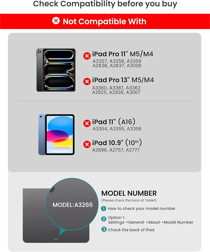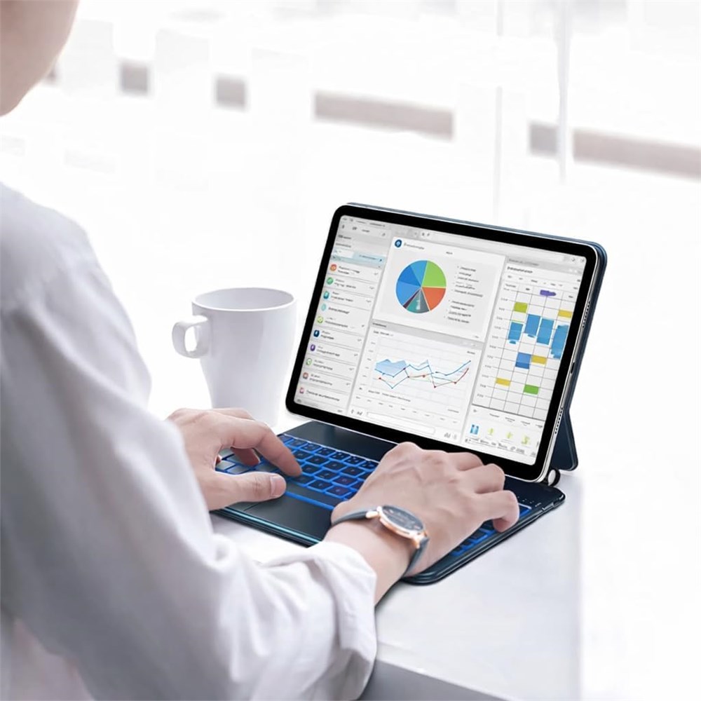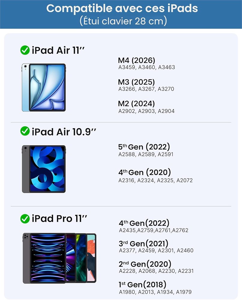 Compatible uniquement avec iPad Air 11" (M4/M3/M2, 2026/2025/2024) et iPad Pro 11" 4e/3e/2e/1 re g n ration (2018-2022), iPad Air 5 et 4. Mod les A3 inclus 459, AA. 3460, A3463, A3266, A3267, A3270, A2902, A2903, A2904, A2759, A2435, A2761, A2762, A2377, A2301, A2459, A2460, A2228 A2068, A2230, A223, A1980, A2013, A1934, A1979, A2588, A2589, A2591, A2072, A2316, A2324, A2325. De l'aube au cr puscule, adaptez sans effort Le r glage de 11 r tro clairage et 3 niveaux de luminosit garantit des visuels clairs dans chaque param tre, am liorant votre exp rience immersive. Am liorez votre exp rience iPad avec notre clavier pr cis et polyvalent. Naviguez sans effort au travail et au jeu avec un pav tactile complet. Une fermeture magn tique fiable assure la s curit et la s curit de votre iPad, tout en fournissant un endroit s r pour votre crayon. Transformez votre iPad en un ordinateur portable l gant en quelques secondes. Parfait pour les moments en d placement et lib rer la cr ativit selon vos conditions.
