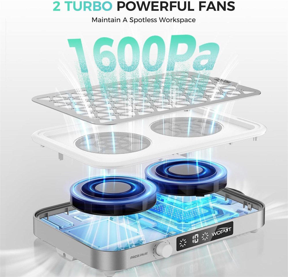 POWERFUL SUCTION The nail dust collector have 2 x 6500RPM turbo fan with brushless motor generating 1600PA of suction. It can adsorb and collect the nail dust from 360 degrees efficiently with 99.99% vacuum effect. A must-have for nail salon, allow customers to enjoy a better quality of service. NO CLEANING The nail dust collector comes with 30 disposable filter papers. You only need to tear off the old ones and replace them with new ones to get a brand new feeling. It not only ensures cleanliness and hygiene but also saves cleaning time, and is preferred nail art helper. EASY CONTROL The nail dust collector tech can easily adjust 10 wind speeds through 1 knob control and display on the LED screen. It is easy to use for both novices and professional nail artists, and can also meet your various usage scenarios. DURABLE & PORTABLE We features a unique bottom heat dissipation design, make sure it will not overheating even doing the long-lasting work and enjoy a reliable, safe, and prolonged service life nail dust collector. Ultra-thin body with exquisite handle to convenient for carrying outside.