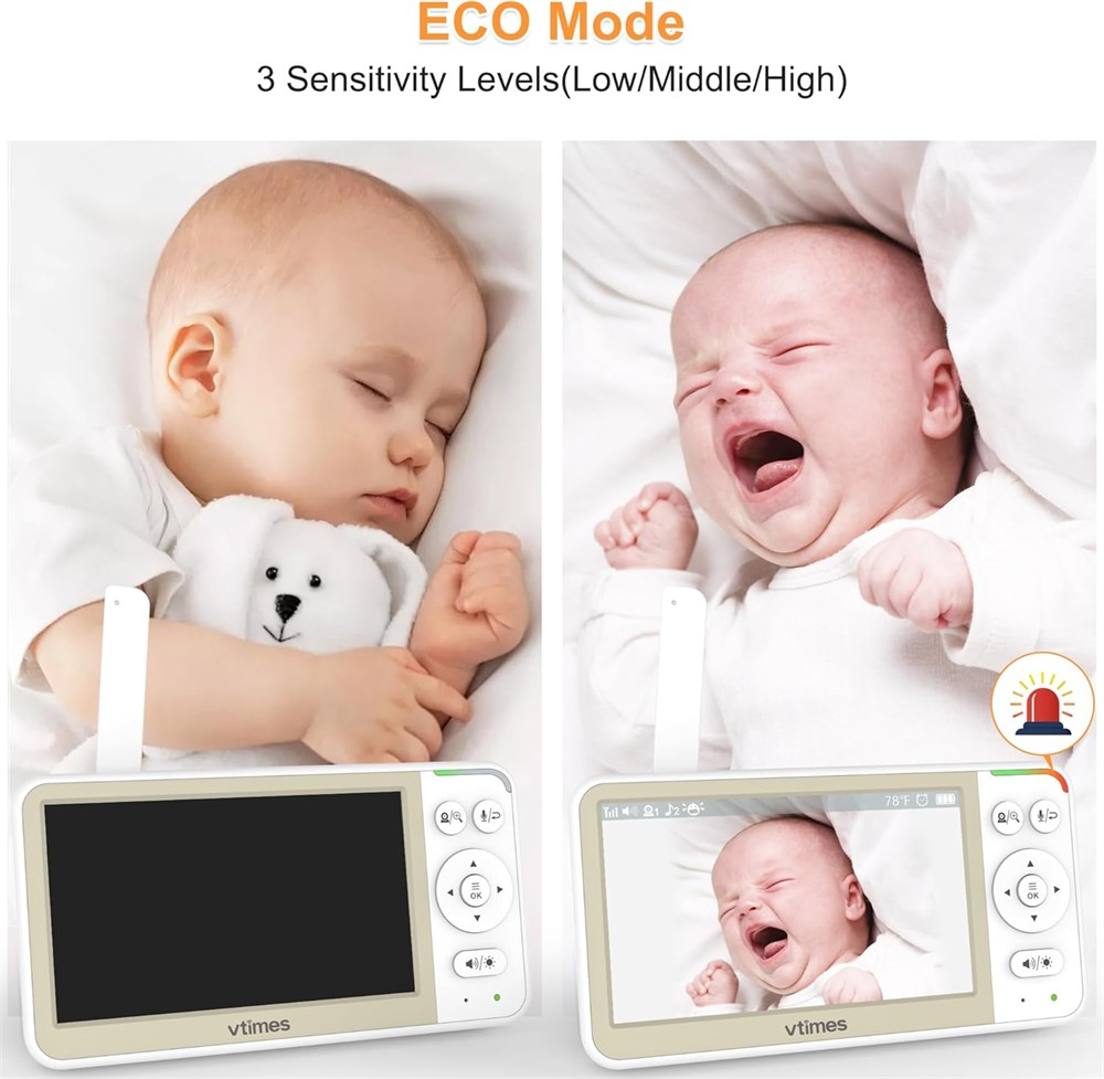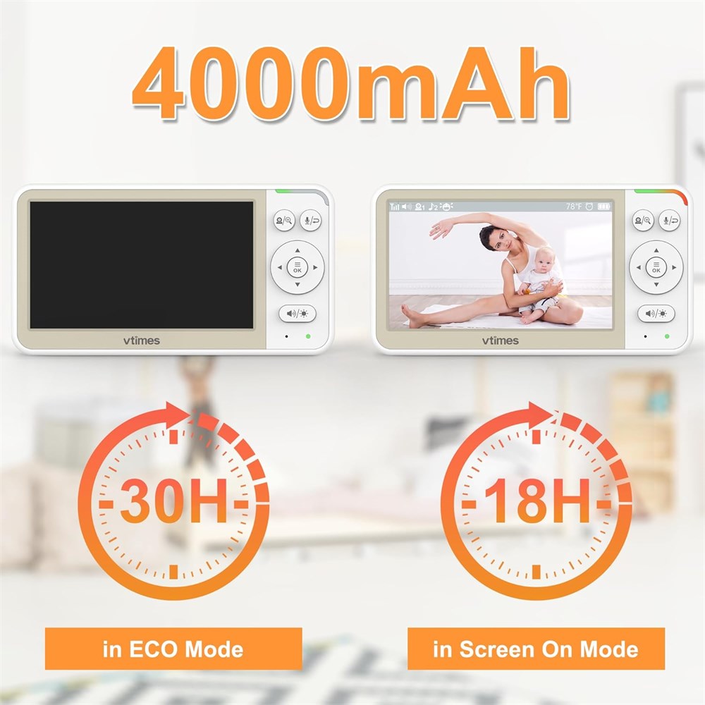 5" Clear IPS Display Enjoy a crystal-clear view on the generous 5-inch IPS display of our baby monitors. With its high-resolution display and IPS technology, you can see every detail with clarity. Plus, No wifi baby monitor protects your security and privacy. Long-lasting Battery Equipped with a powerful 4000mAh battery, our video baby monitor ensures extended usage time for uninterrupted monitoring. In ECO mode, the battery can last up to 30 hours, while the screen-on mode can maintain up to 18 hours of continuous operation. Day and night, it's your reliable guardian for your baby's safety and security. Smart VOX Function Our baby monitor camera features three sensitivity levels low, middle, and high. With the high sensitivity setting, even the slightest sound from your baby is detected, ensuring comprehensive monitoring and prioritizing your child's safety. Smart Features Our travel baby monitor offers various convenient features. This baby camera monitor ensures you're always connected, from soothing lullabies and temperature monitoring to feeding reminders, two-way talk, and infrared night vision. Plus, with auto Pan-Tilt-Zoom functionality, keeping an eye on your little one has never been easier. Plug and Play Our baby monitor with camera and audio offers simple plug-and-play functionality, allowing for hassle-free setup. Just plug in the monitor and camera, and you're ready to go. Plus, automatic night vision ensures clear visibility even in low-light conditions. Any questions you have, feel free to contact.